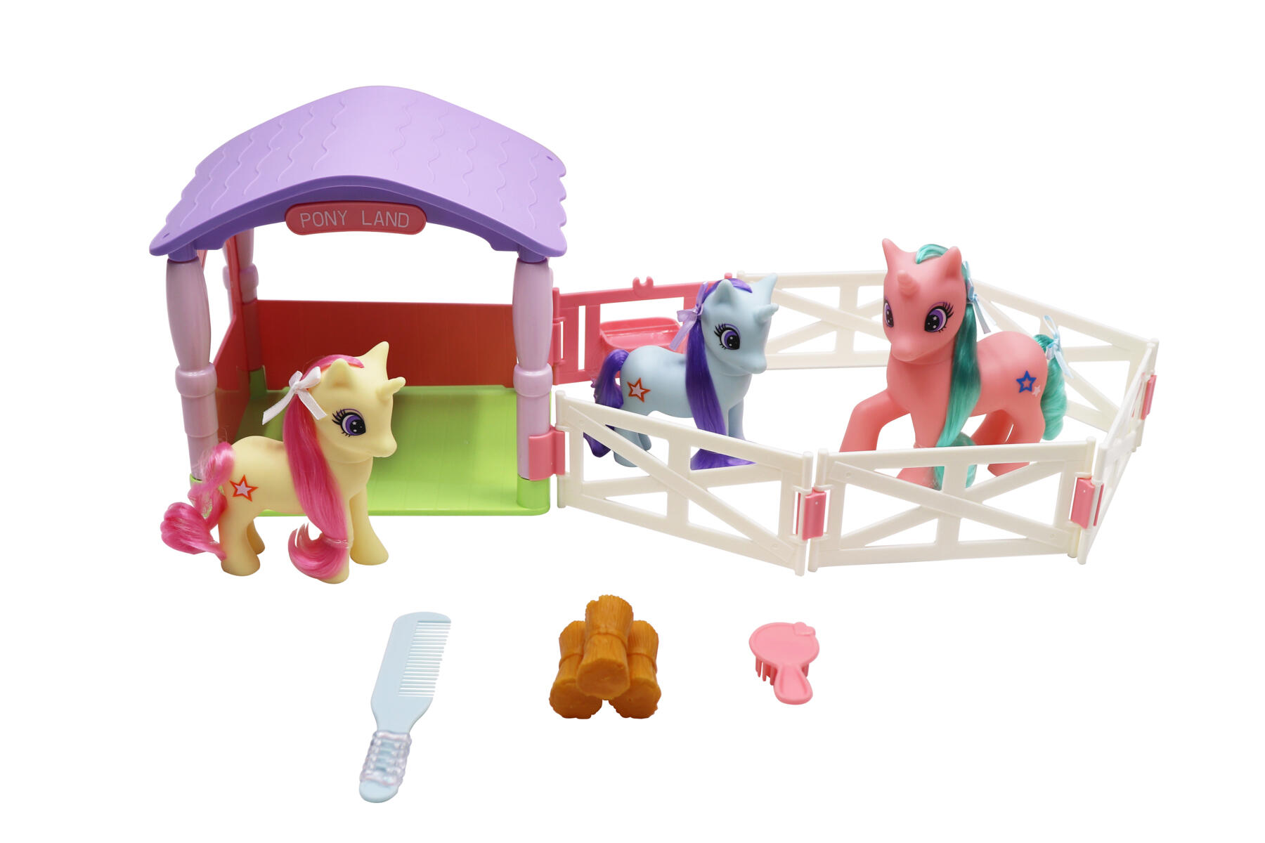 5 delar/fp. En ponnyfamilj med långa manar att kamma och frisera. Innehåller 2 sagohästar och 3 föl. Längd: sagohäst ca 14 cm och föl ca 10 cm. Av PE och PVC, utan förbjudna ftalater. Från 3 år.