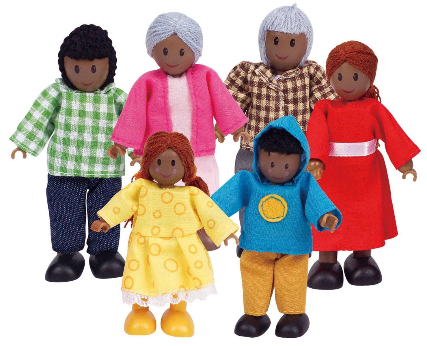 Dockfamilj med böjbara armar och ben. Familjen består av 4 vuxna och 2 barn. Av trä och plastdetaljer av POM. PVC-fri. Från 3 år.