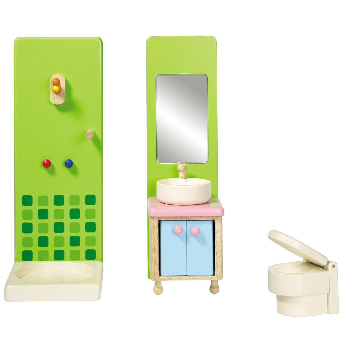 Ett stort och snyggt badrum av trä. Innehåller dusch, wc och handfat med öppningsbart underskåp och plastspegel. Passar till dockskåp 17477, eller för fristående lek. Av FSC-märkt trä. PVC-fri. Från 3 år.