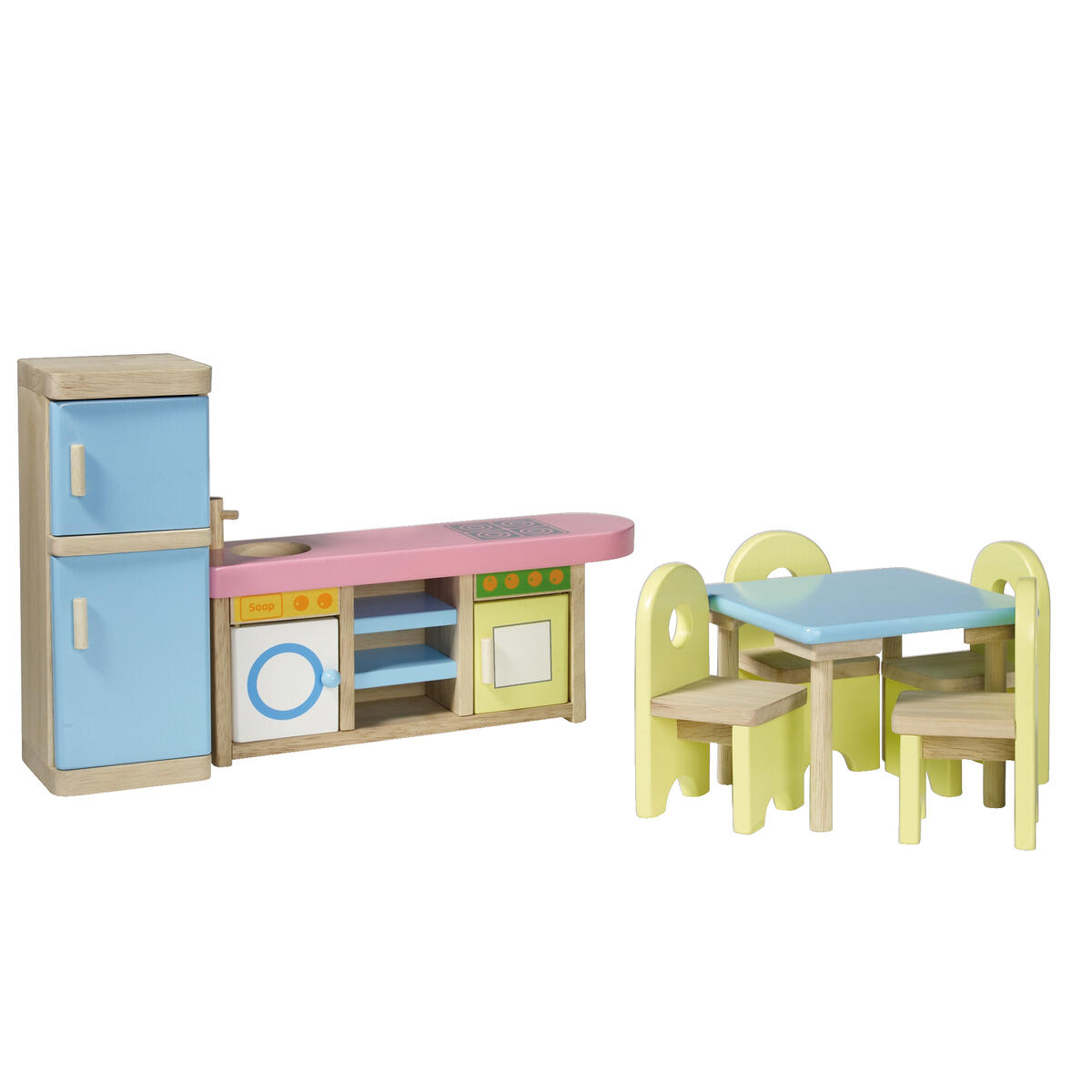5 delar. Innehåller: Diskbänk med spis, kyl- och frysskåp, 2 stolar och 1 bord. Kyl- och frysskåpet är 9 cm högt och 4 cm brett. Av FSC-märkt trä. PVC-fri. Från 3 år.