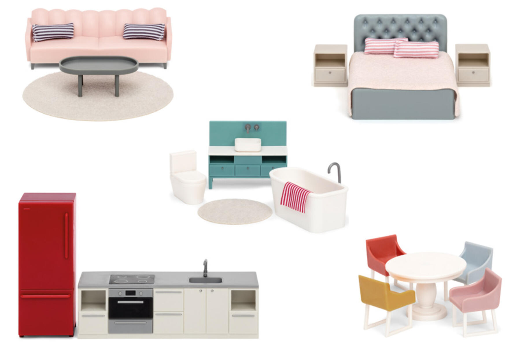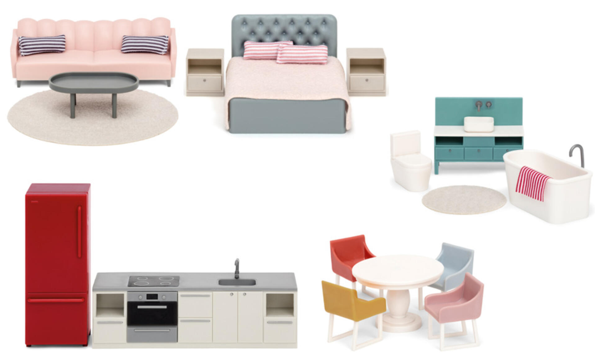 Ett set med dockhusmöbler som innehåller badrum, kök, sovrum och vardagsrum. Av återplanterat gummiträd. Mått på säng är 32x27 cm, skåp 25x9 cm, stol 14x7 cm, soffa är 21x11 cm och dusch är 12x12x32 cm. PVC-fri. Från 3 år.