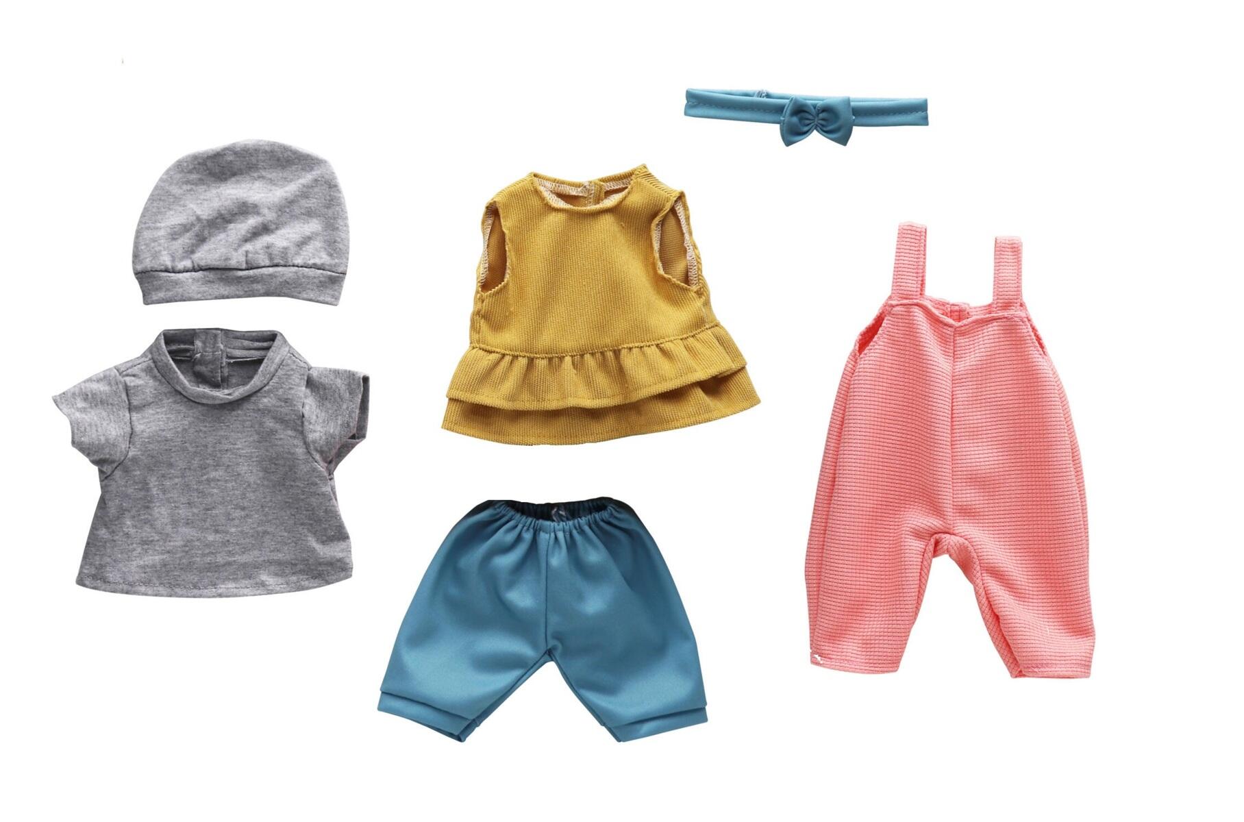 9 delar/fp. Dockkläder som passar till dockor 21 cm. Innehåller byxa, tröja, mössa, linne, trosa och en jumpsuit. Maskintvätt 40 °C. PVC-fri. Från 3 år.
