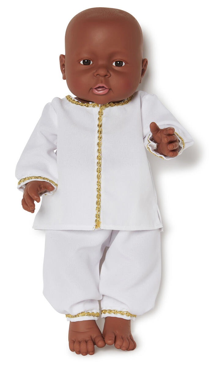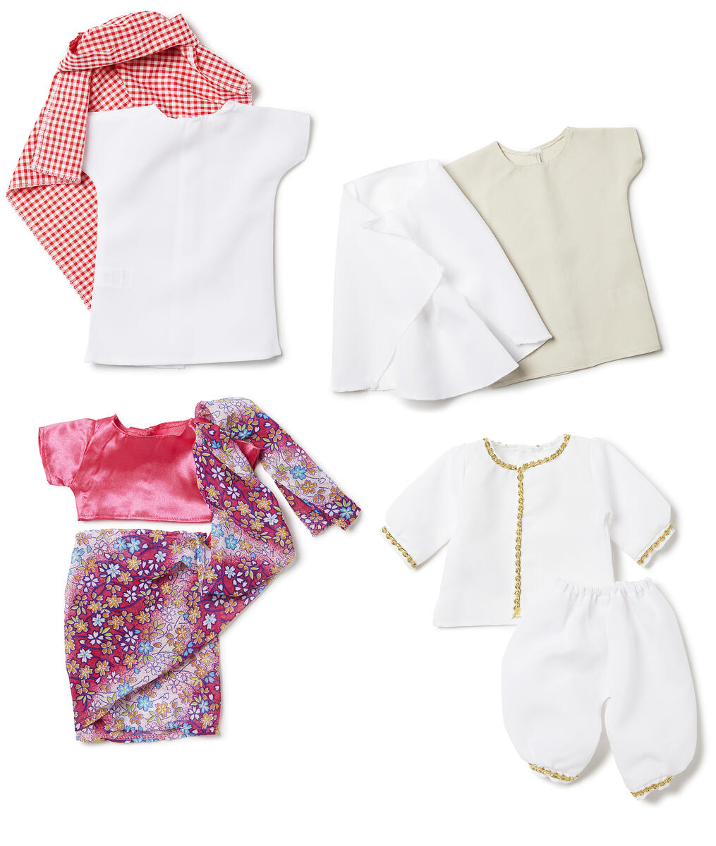 Klä dockorna i kläder från olika länder. Passar dockor 35–38 cm. Färgvariationer kan förekomma. Av Oeko-texcertifierad, klass 1 polyester. Fintvätt. PVC-fri. Från 3 år.