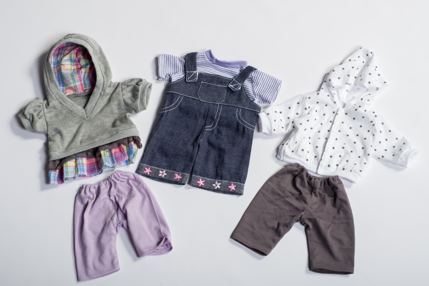 Fina dockkläder som passar dockor 38–42 cm. Innehåller 2 byxor, 2 prickiga tröjor, mössa och halsduk. Av Oeko-Texcertifierad bomull och polyester. PVC-fri. Från 3 år.