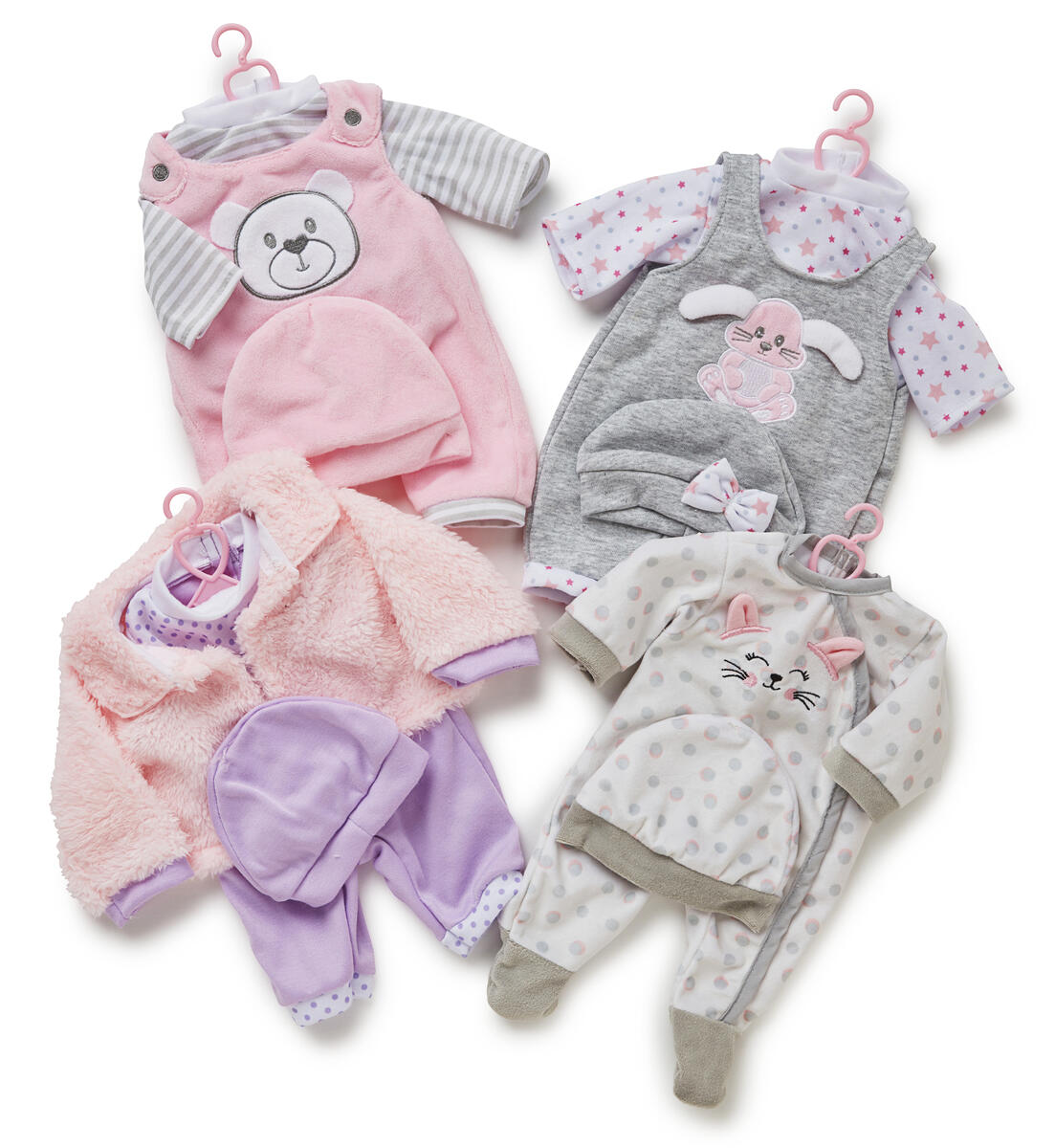 9 delar/fp. Dockkläder som passar till dockor 21 cm. Innehåller byxa, tröja, mössa, linne, trosa och en jumpsuit. Maskintvätt 40 °C. PVC-fri. Från 3 år.