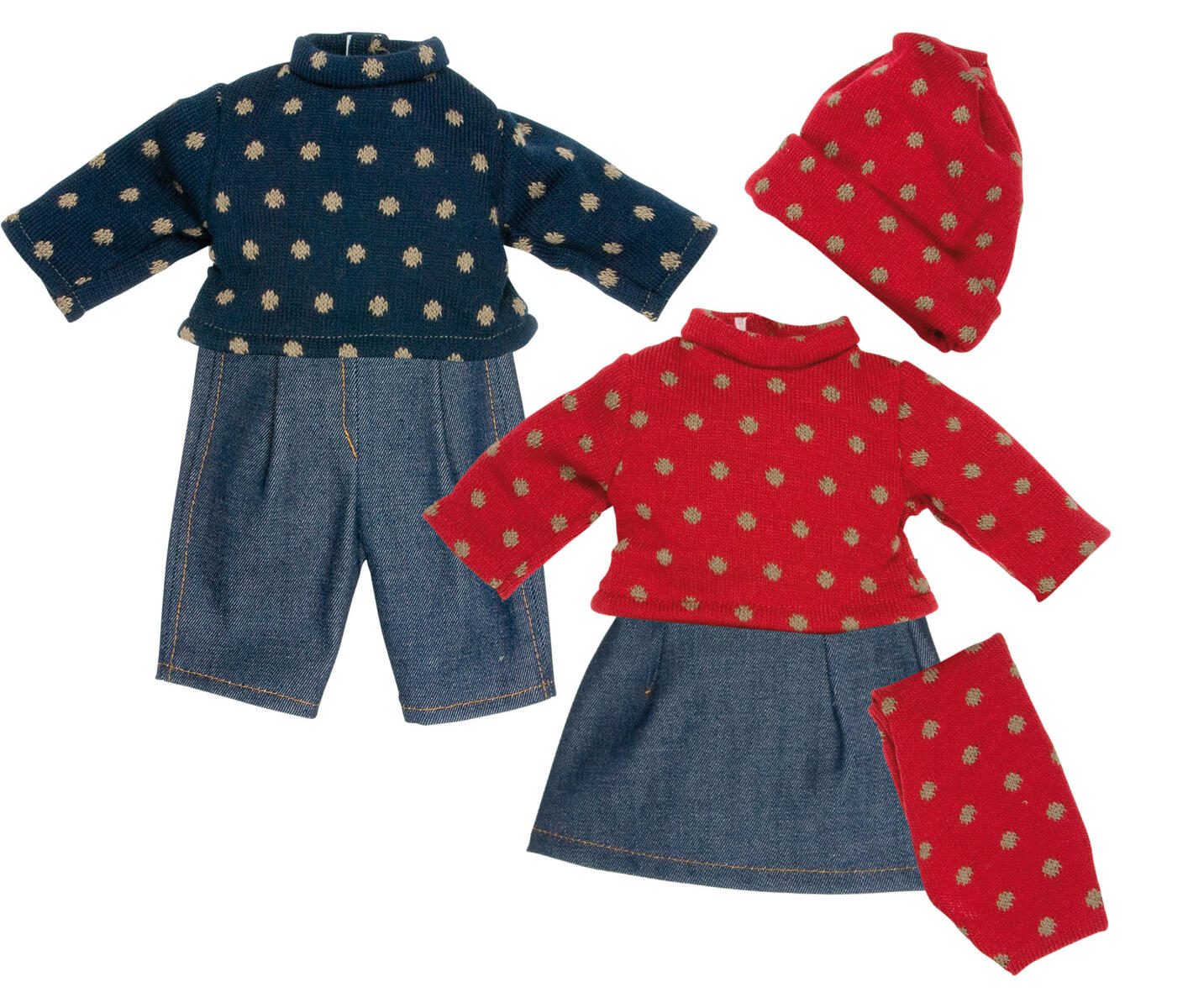 Fina dockkläder som passar dockor 38–42 cm. Innehåller 2 byxor, 2 prickiga tröjor, mössa och halsduk. Av Oeko-Texcertifierad bomull och polyester. PVC-fri. Från 3 år.