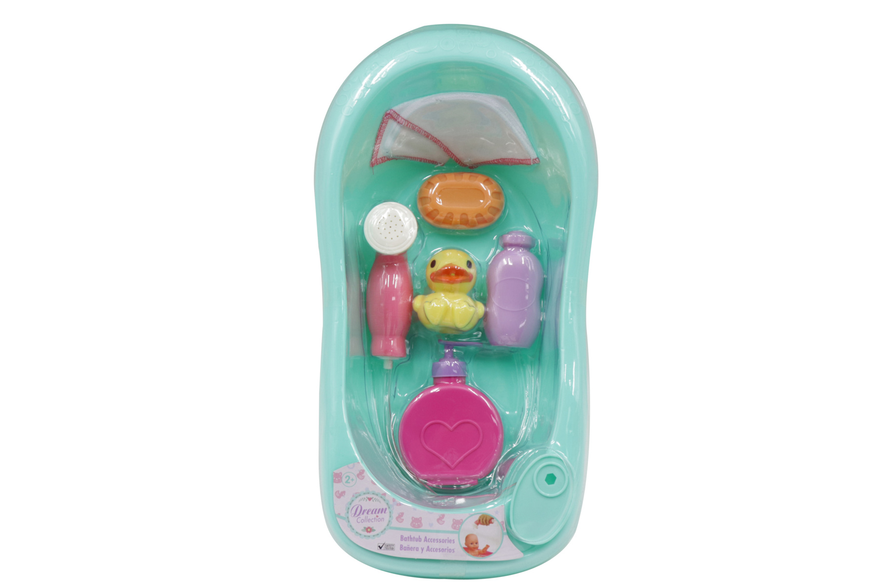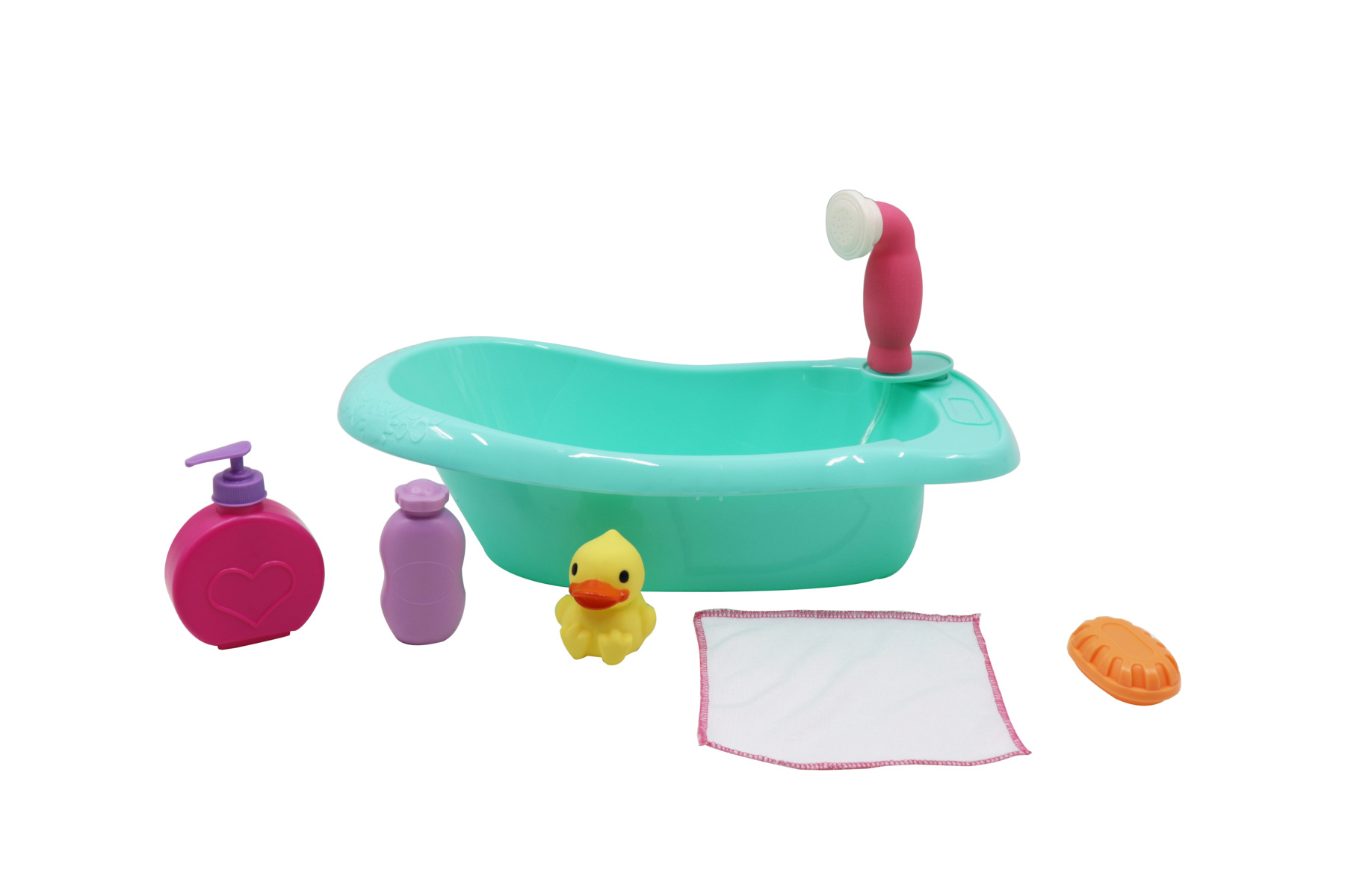 Ett badkar med tillbehör som innehåller allt som behövs när dockan ska bada. Mått: L39xB20xH11 cm. Av PVC, utan förbjudna ftalater. Från 2 år. Blandade färger.