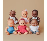 6 st/fp. Dockor med hård kropp och fina kläder. Blandade modeller, dubbletter kan förekomma. Längd 21 cm. Tillverkad av PVC, utan förbjudna ftalater. Från 10 månader.