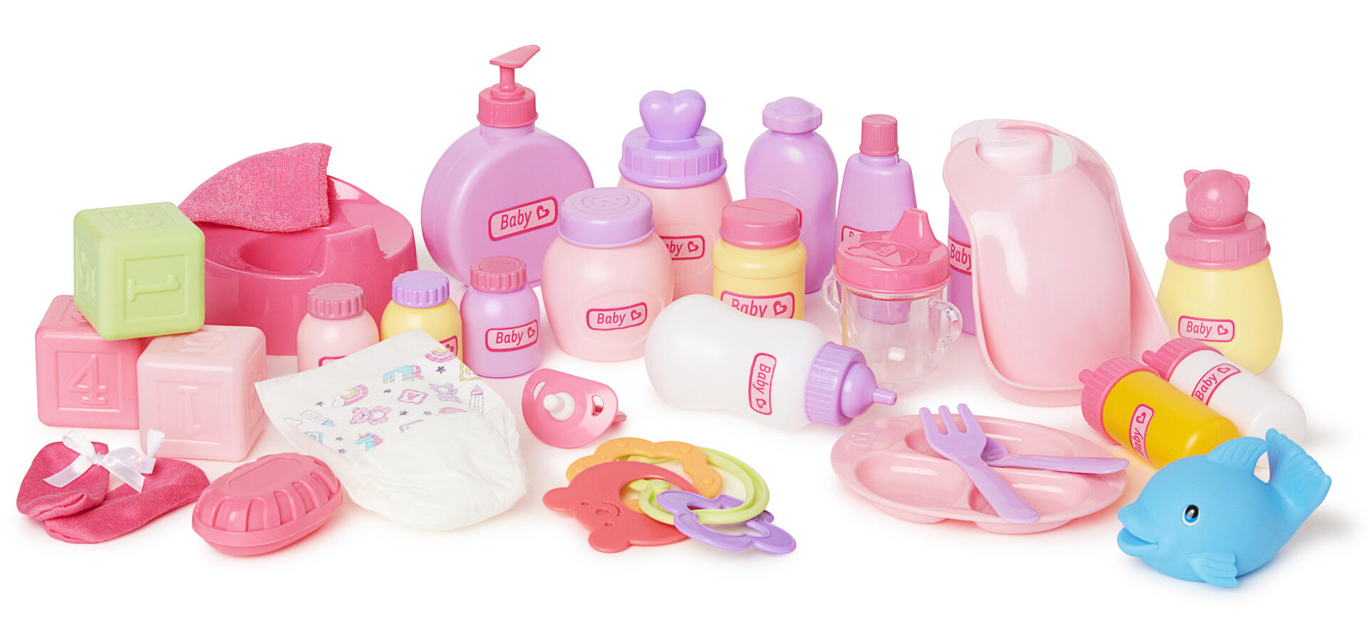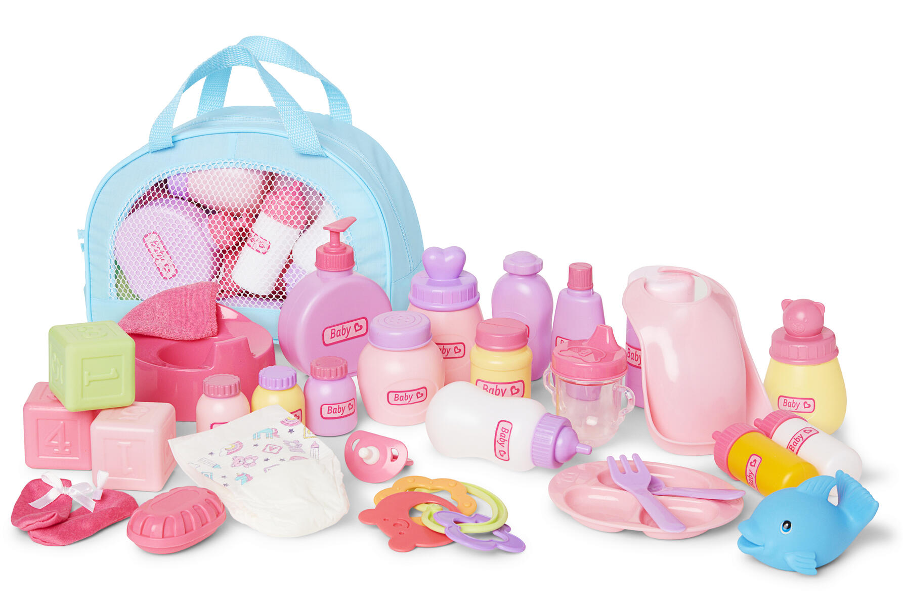 30 delar/fp. Ett stort set med docktillbehör. Setet innehåller bland annat nappflaskor, en potta, leksaker, napp, tallrikar och bestick samt leksaksmat. Allt får plats i en praktisk väska för enkel förvaring. Material av HIPS, LDPE och PE. PVC-fri. Från 3 år.