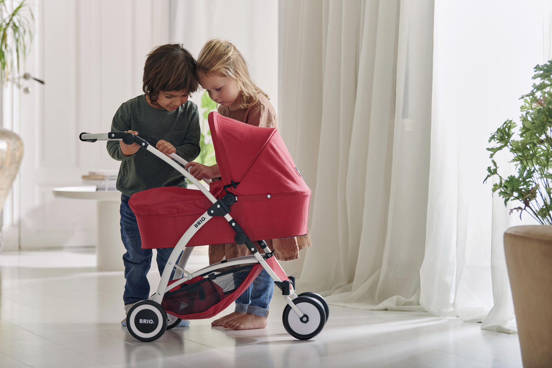 Dockvagnen har ett handtag, som är justerbart för att passa barn med olika längd, samt en mjuk urtagbar bärinsats. Med ett justerbart säte kan dockan ligga och sova eller sitta upp och titta. Fällbar sufflett och praktisk shoppingkorg undertill. Mått: L60xB36xH70 cm. PVC-fri. Från 3 år.