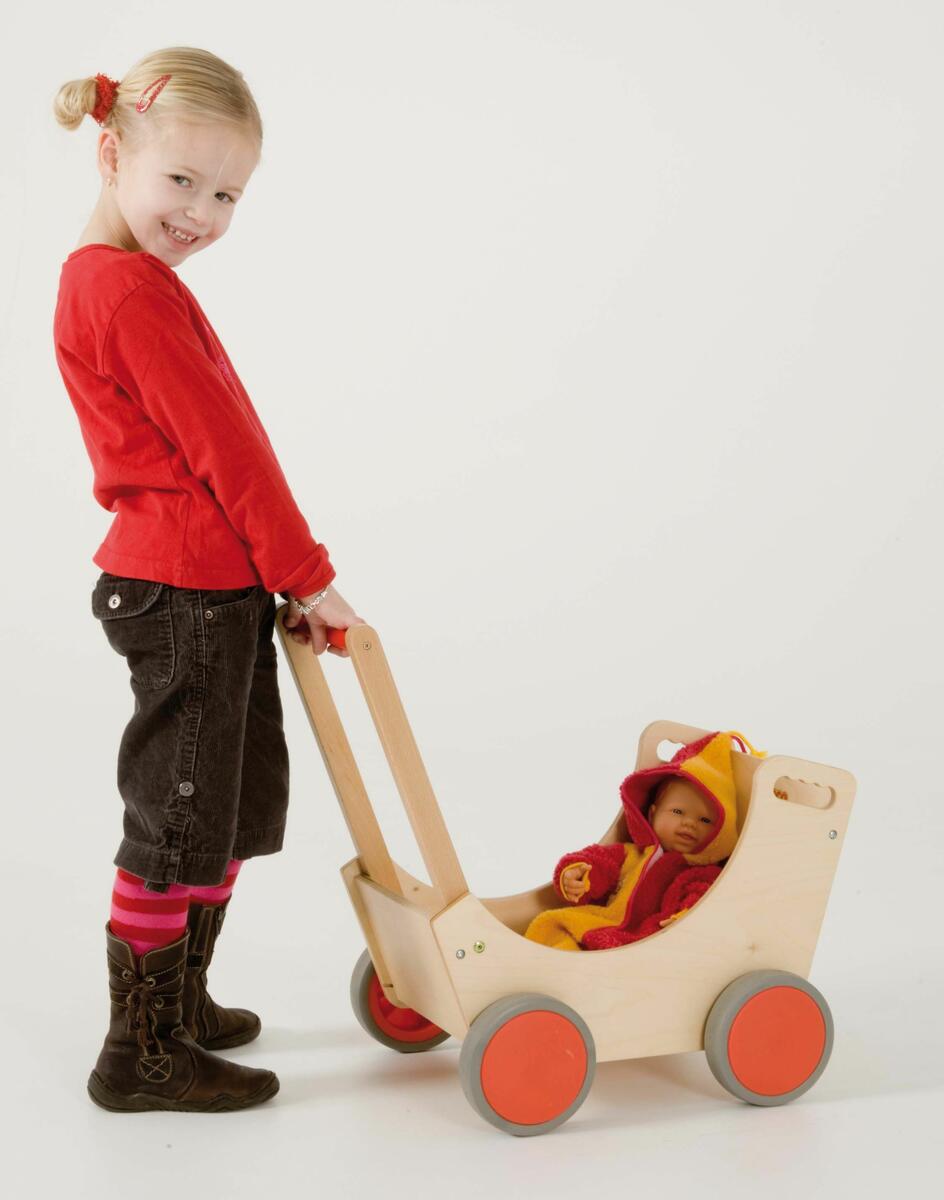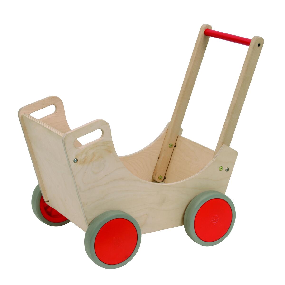 En dockvagn av FSC-märkt trä med fast sufflett. Gummilist runt hjulen ger en tyst framfart. Ett rutigt täcke att bädda med ingår. PVC-fri. Från 18 mån.