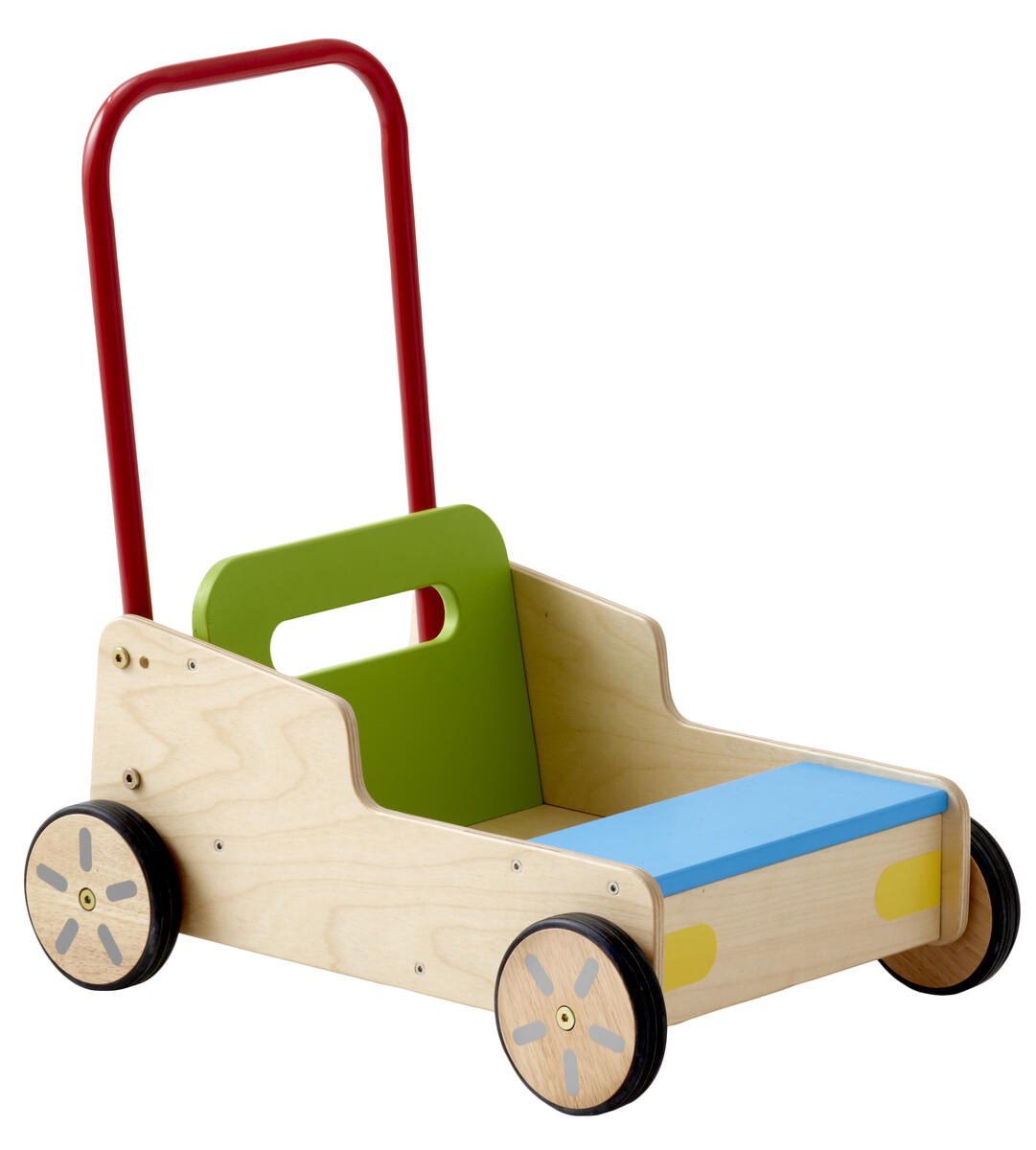 En stabil lära-gå-vagn som lämpar sig för lek och gångträning ute eller inne. Robust konstruktion och ljudabsorberande gummihjul. Från 1 år.