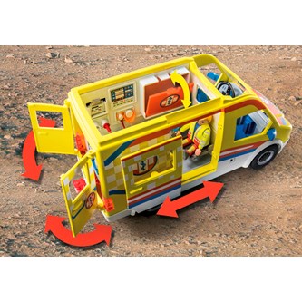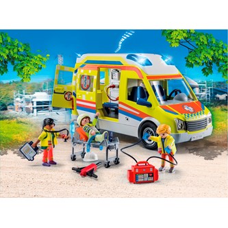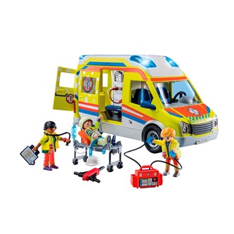 54 delar. Om olyckan mot förmodan skulle vara framme och någon av dina Playmobilfigurer snabbt behöver kommer till sjukhus så behövs en supersnabb ambulans. Setet innehåller ambulansbil, tre figurer och flera tillbehör. För ljud och ljus krävs ett batteri 1,5 V (AAA), ingår ej. Mått: 27x13x14 cm. Av ABS. PVC-fri. Från 4 år.