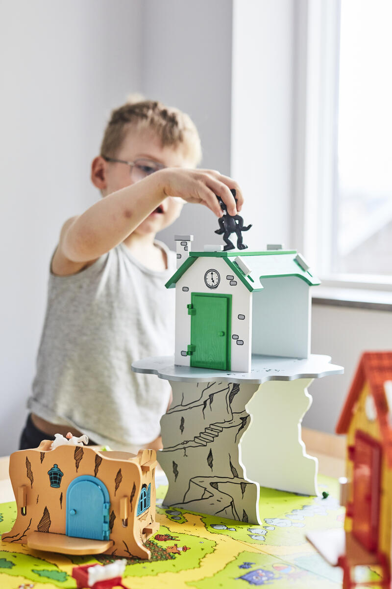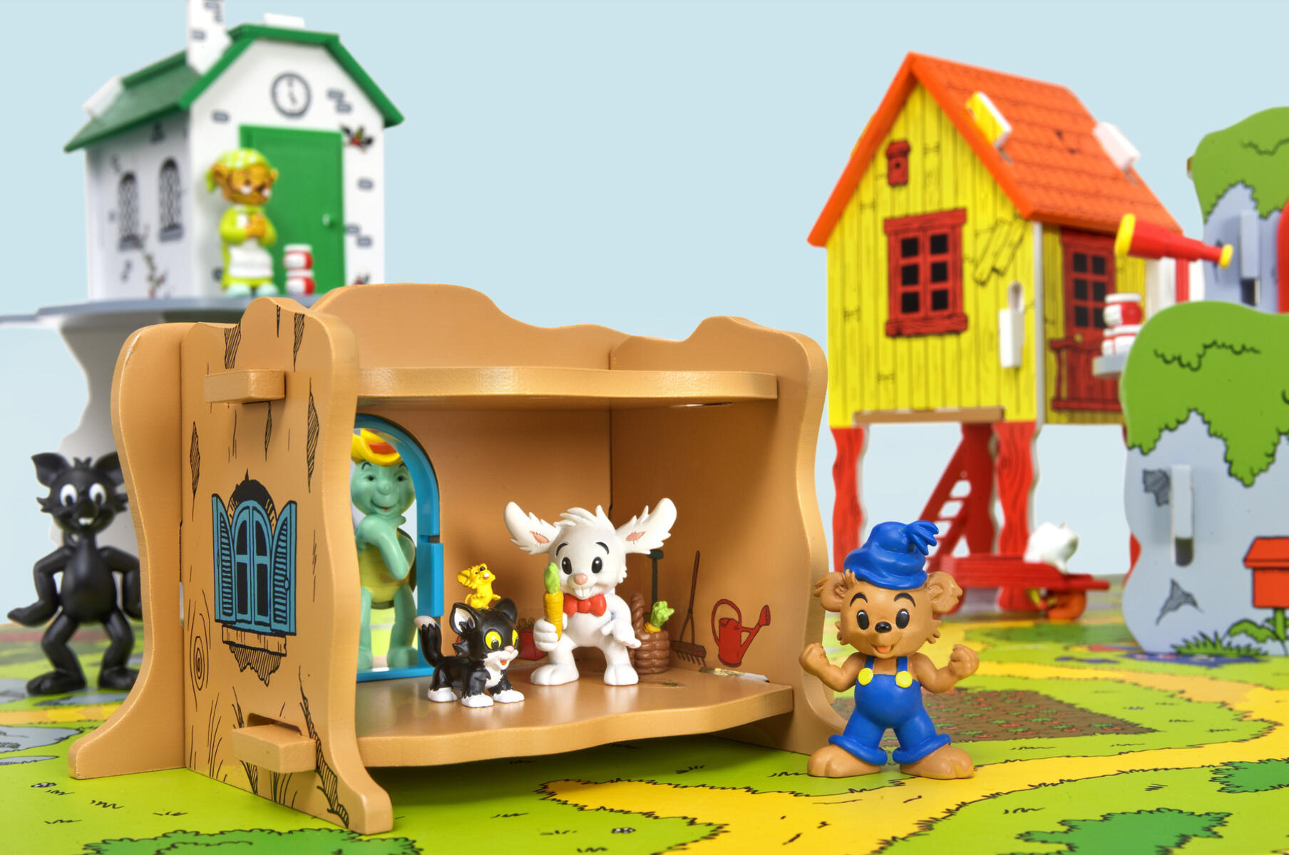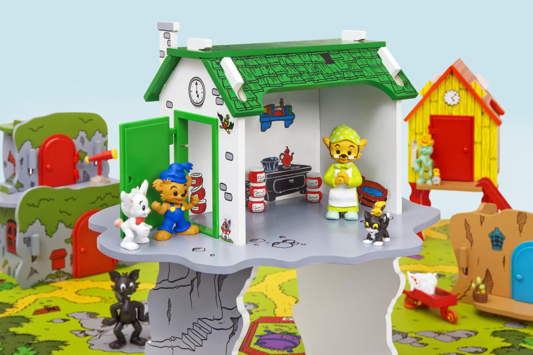 Ett stort set med allt du behöver för att leka i Bamses värld. Bamsebyn på kullarna, med Bamses, Lille Skutts, Skalmans och Farmors hus. De lekvänliga husen är gjorda av FSC-märkt trämaterial och du kan enkelt sätta ihop och plocka isär dem. De passar perfekt på den fina lekplattan av FSC-märkt kartong som föreställer Bamsebyn, med vägar, träd, morotsland och en liten sjö med brygga. Figurer ingår, av TPR. PVC-fri. Från 3 år.