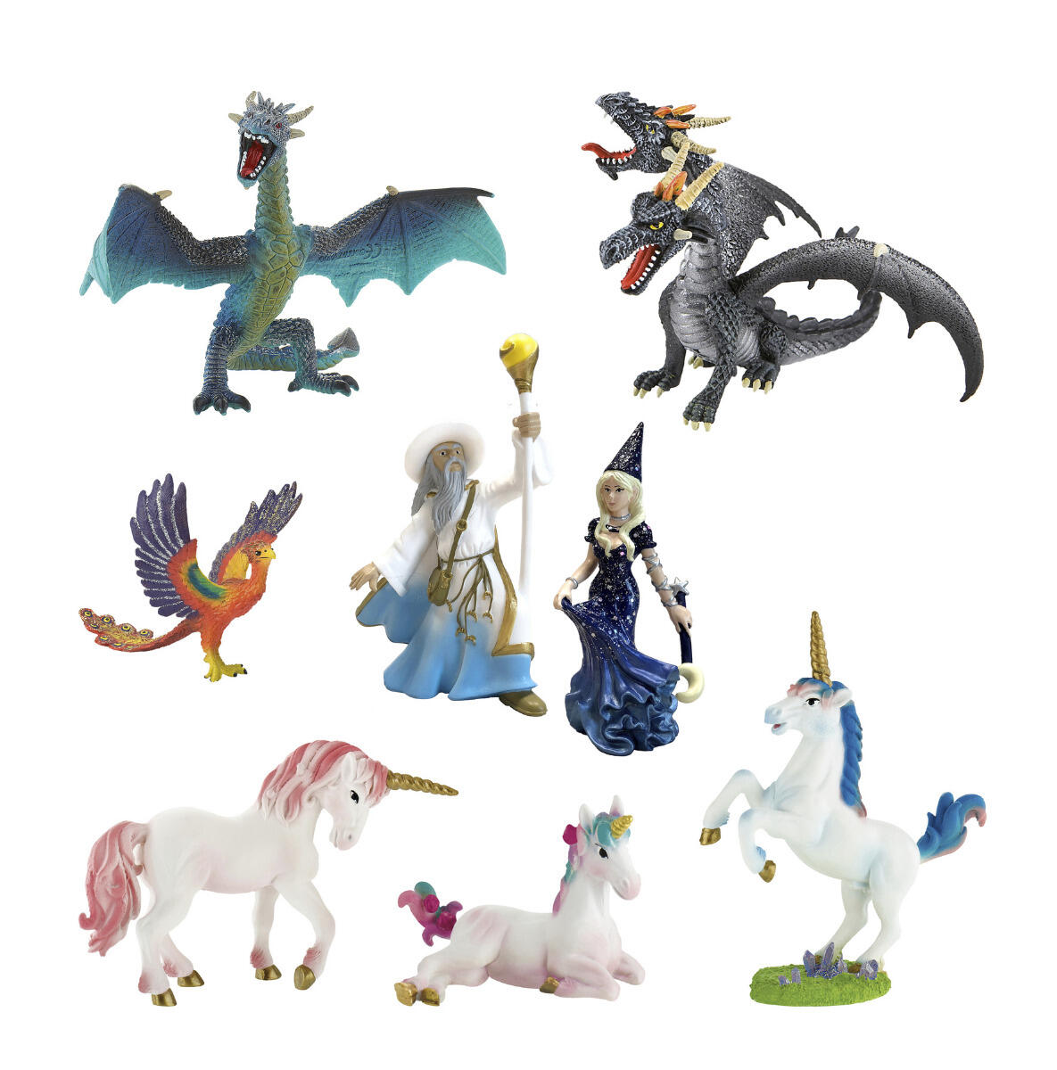 6 st/fp. Ett magiskt set som sätter fart på barnens fantasivärld. Innehåller enhörning, enhörningsföl, Pegasus, Pegasus med regnbågsmönster, svart Pegasus och en guldfärgad drake. Höjd på hästar ca 12 cm. Av PVC, fria från ftalater. Från 3 år.
