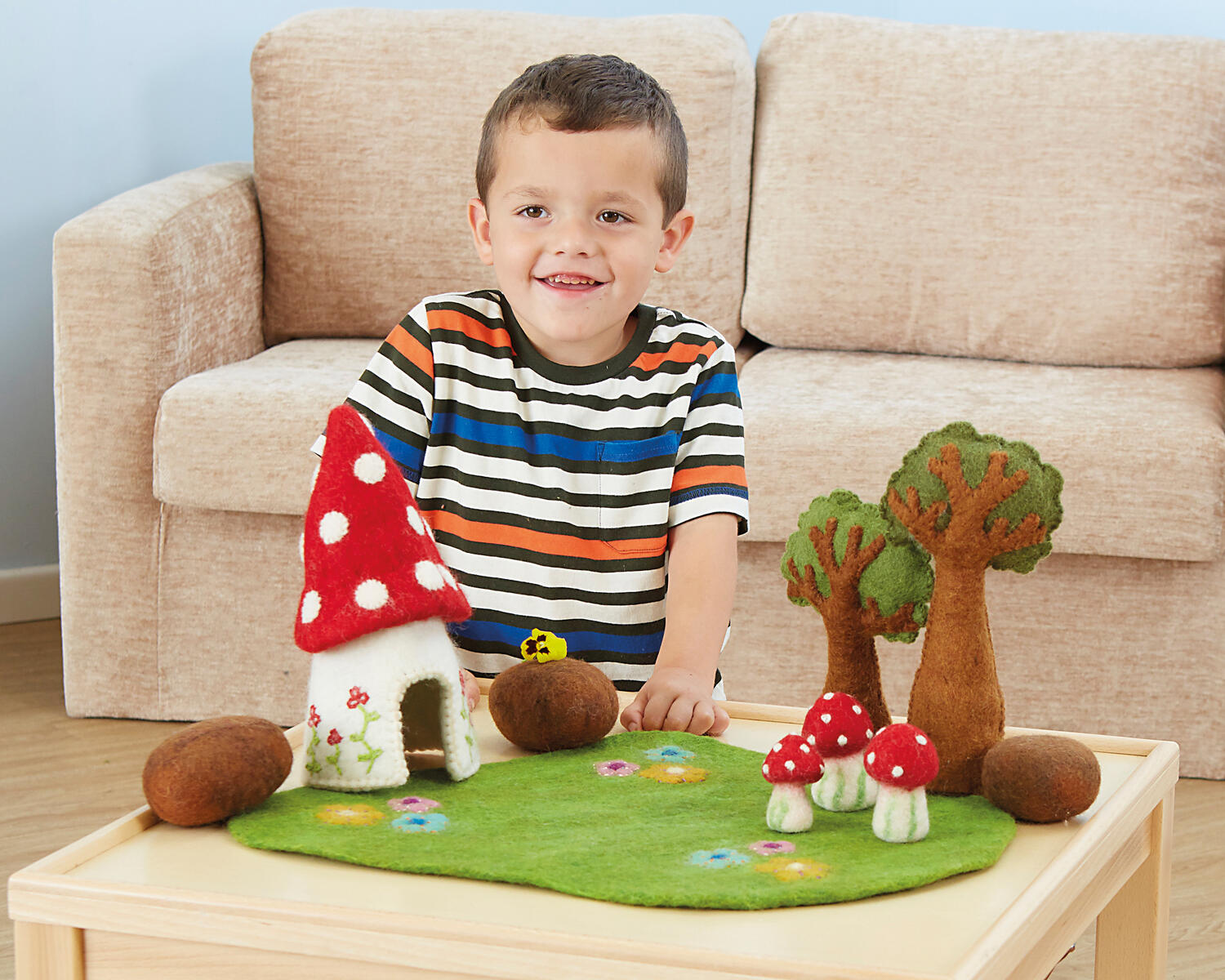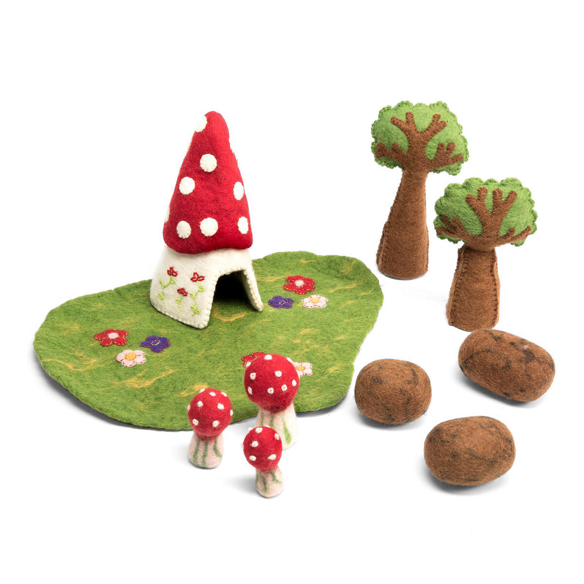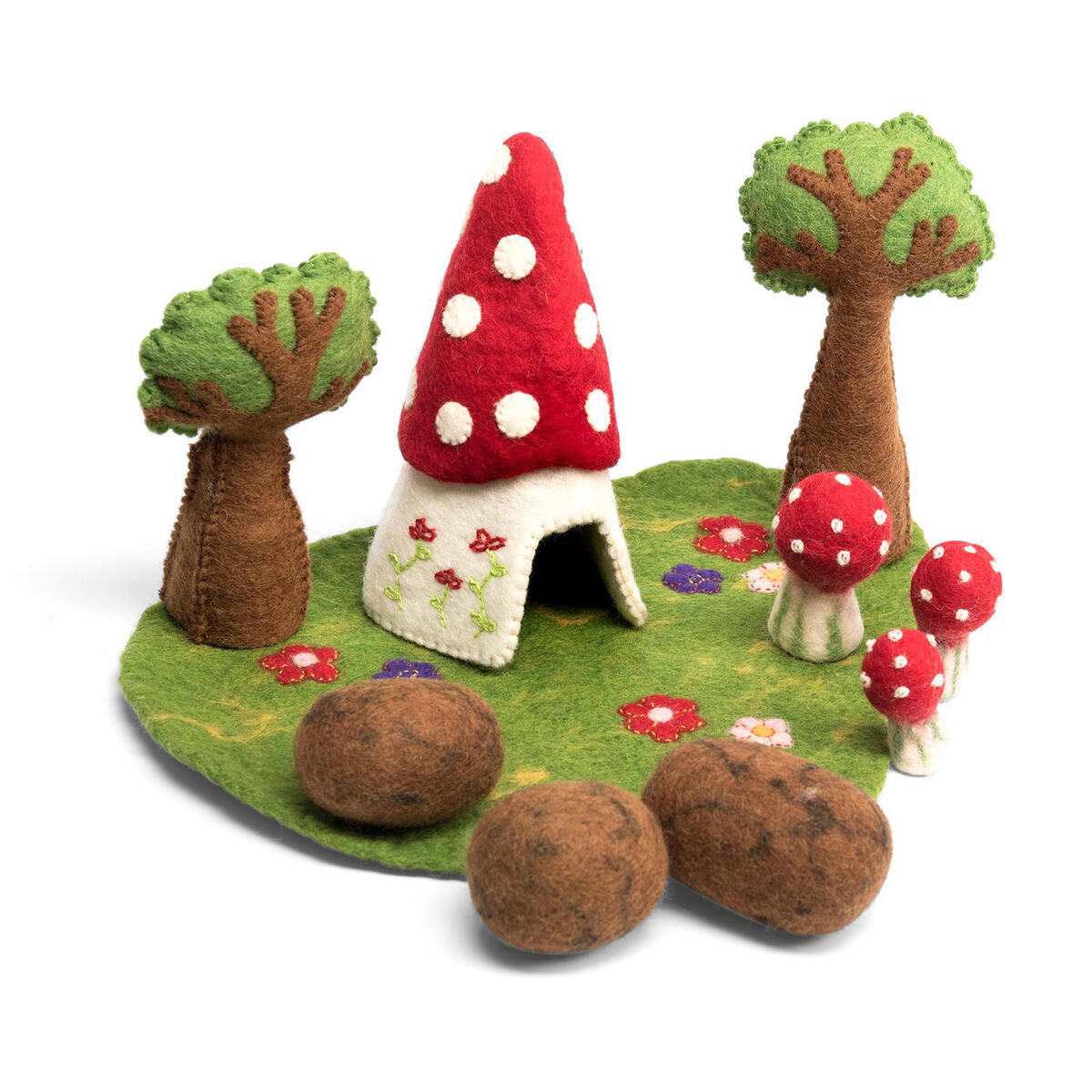 En mycket välgjord miljö för förtrollande sagor. Det förtjusande huset kan t.ex. vara hem för älvor eller feer. Prova gärna att tillverka fevägar, blommor, staket m.m. Innehåller matta, hus, 2 träd, 3 svampar och 3 stenar. Av filt. PVC-fri. Från 3 år.
