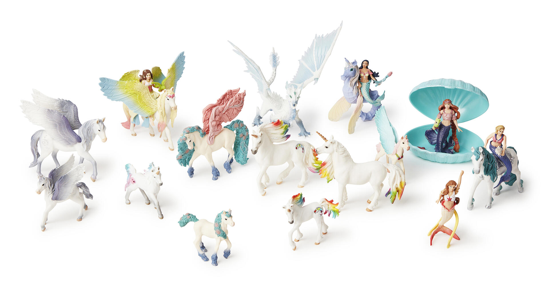 Ett set med älvor och hästar, handmålade och av mycket fin kvalitet. Innehållet kan variera, men antalet figurer är detsamma. Älvan som rider på en pegasus mäter 15x18 cm, ett av det minsta fölen mäter 8,5x9,4 cm. Av PVC, fri från ftalater. Från 3 år.