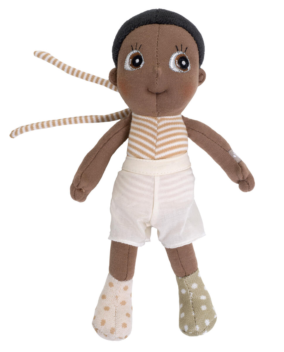Den handgjorda dockan är mjuk och kramgo. Hår, hud och kläder är tillverkat av 100 % ekologisk bomull, stoppning av återvunnen polyester. Mått: 23 cm lång. Dockan kan maskintvättas i 30 °C och torktumlas på låg temperatur. Kläderna handtvättas. PVC-fri. Från 0 år.