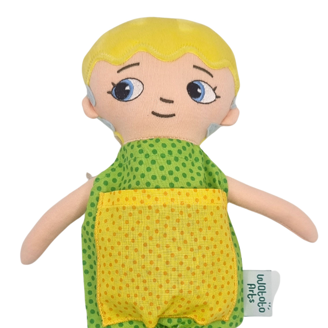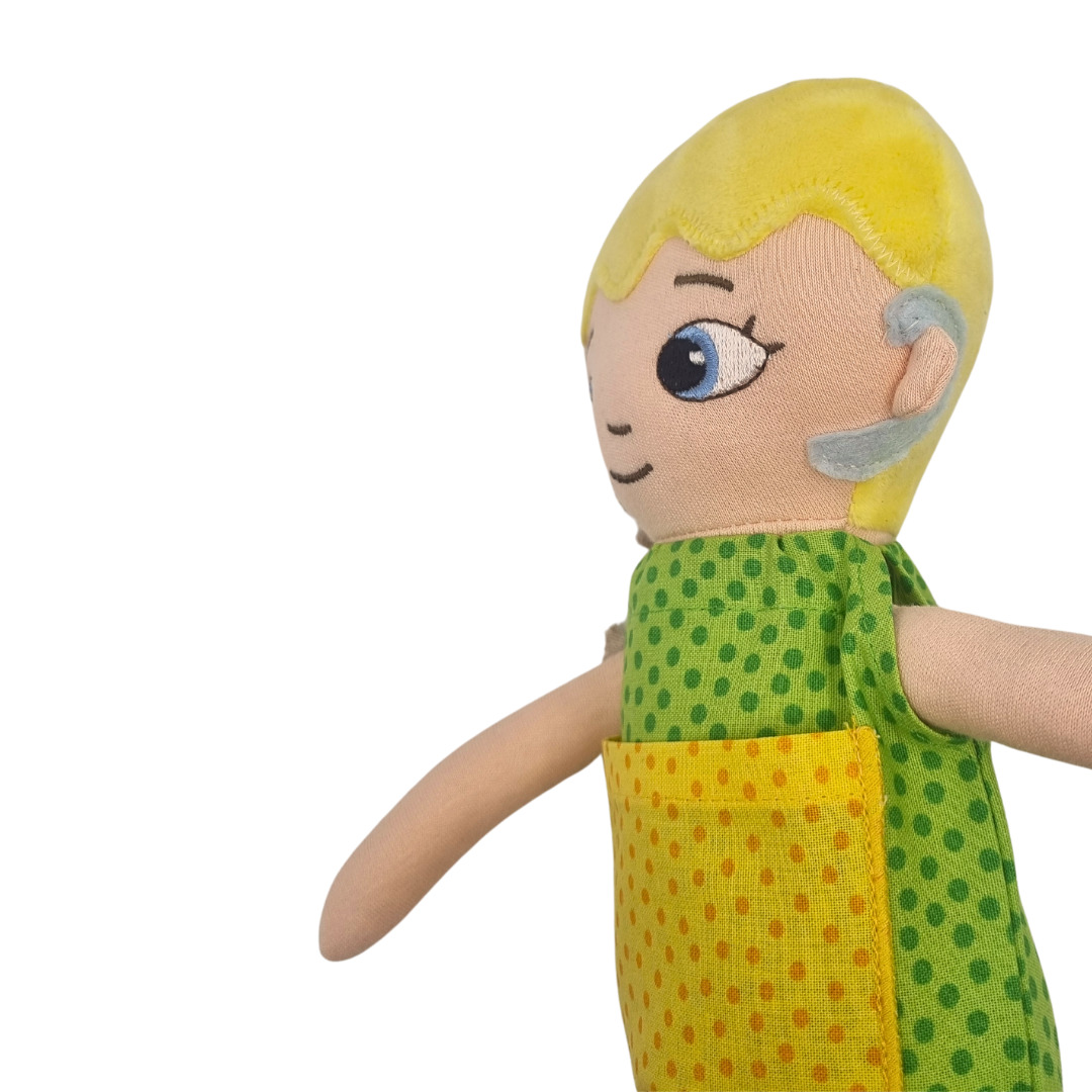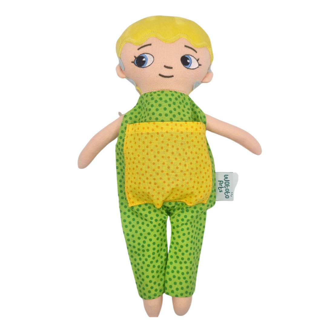 En mjuk docka av tyg med en avtagbar grön och gul jumpsuit. Dockan är kramvänlig och har ett snällt ansiktsuttryck. Maskintvätt 30°. Mått: 36 cm. Från 0 år.