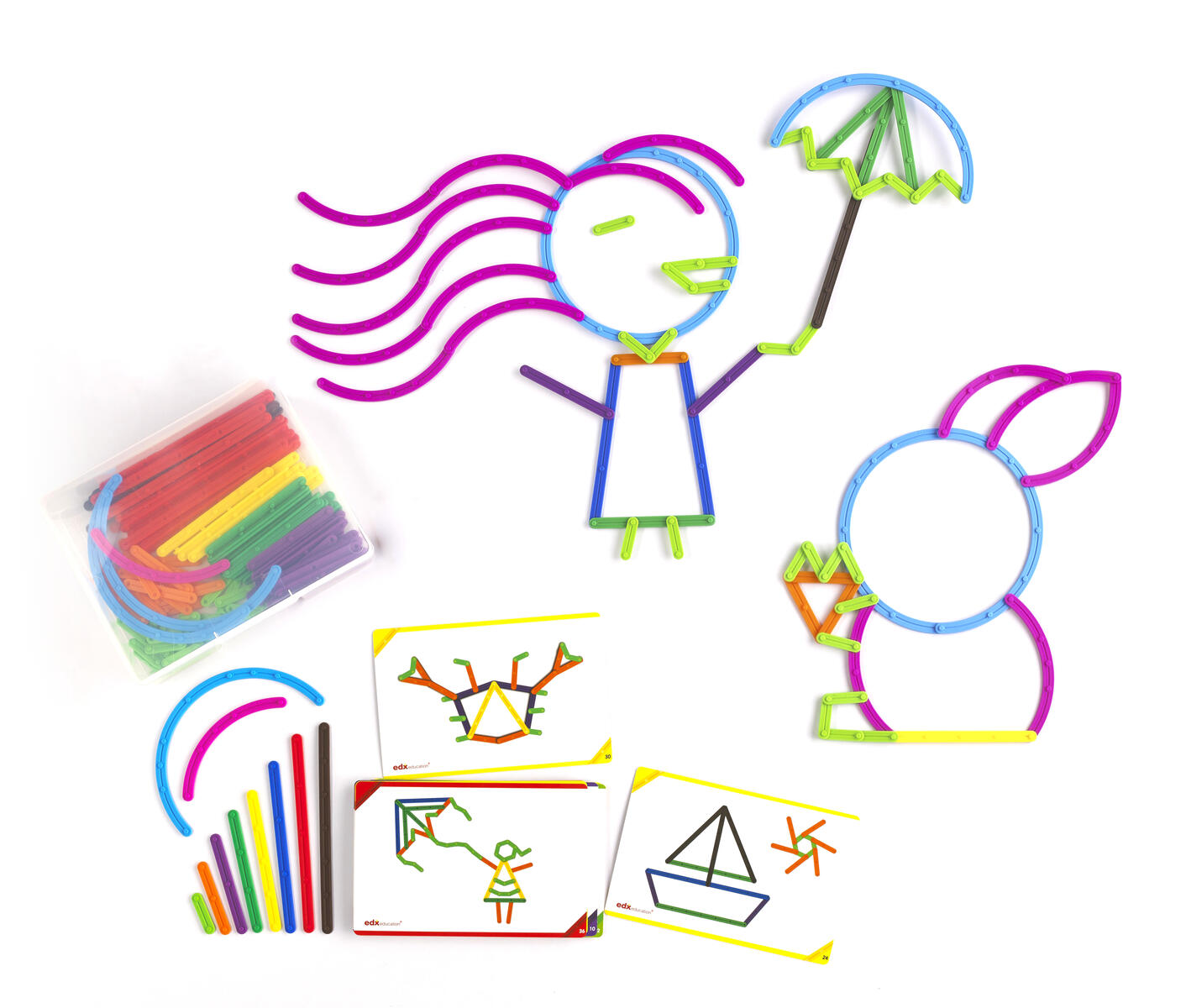 Träna finmotoriken och utveckla de kreativa förmågorna med denna nya byggsats. Innehåller 200 geostix i 10 olika längder av plast som man knäpper ihop. 30 dubbelsidiga aktivitetskort att bygga efter medföljer. Av polyetenplast. PVC-fri. Från 3 år.