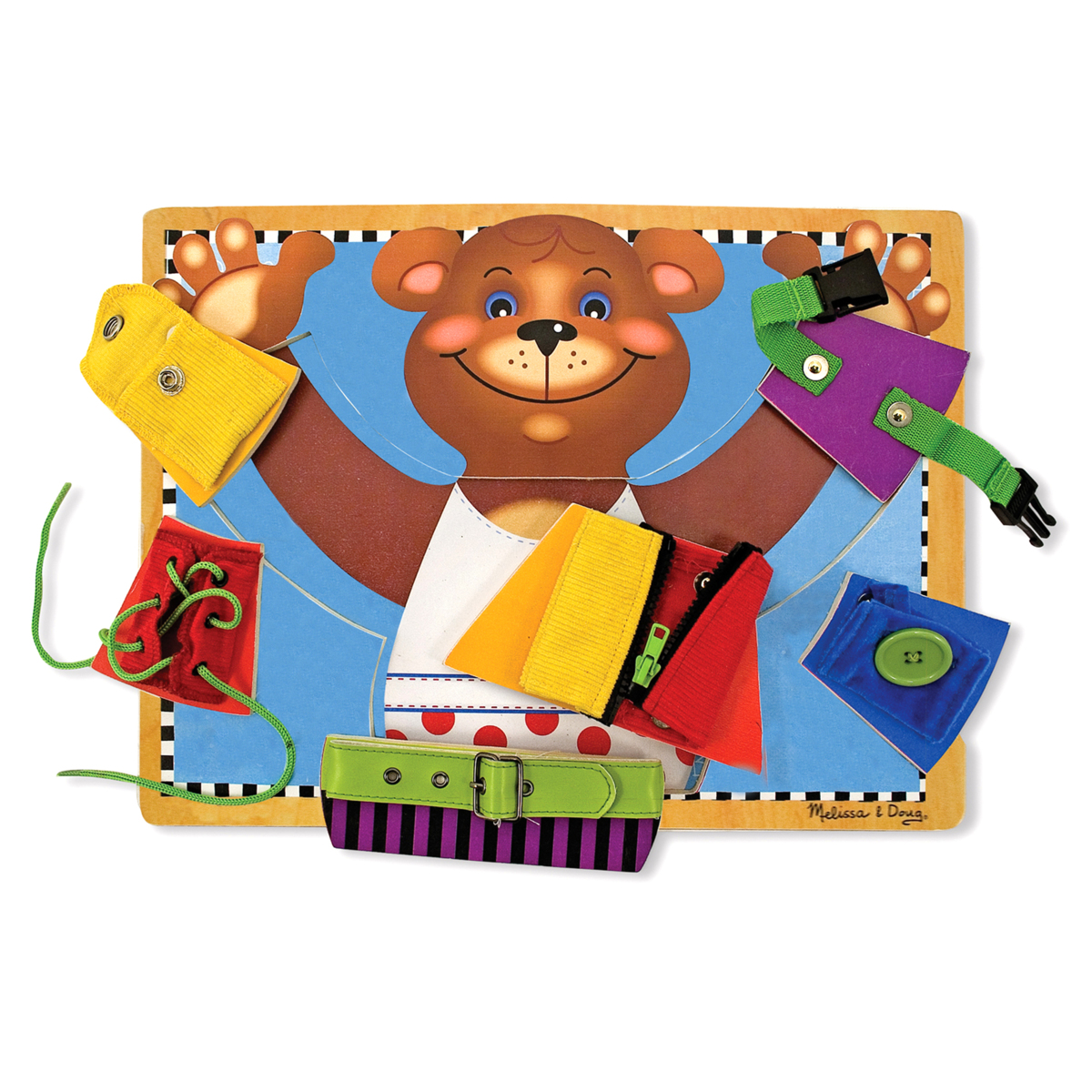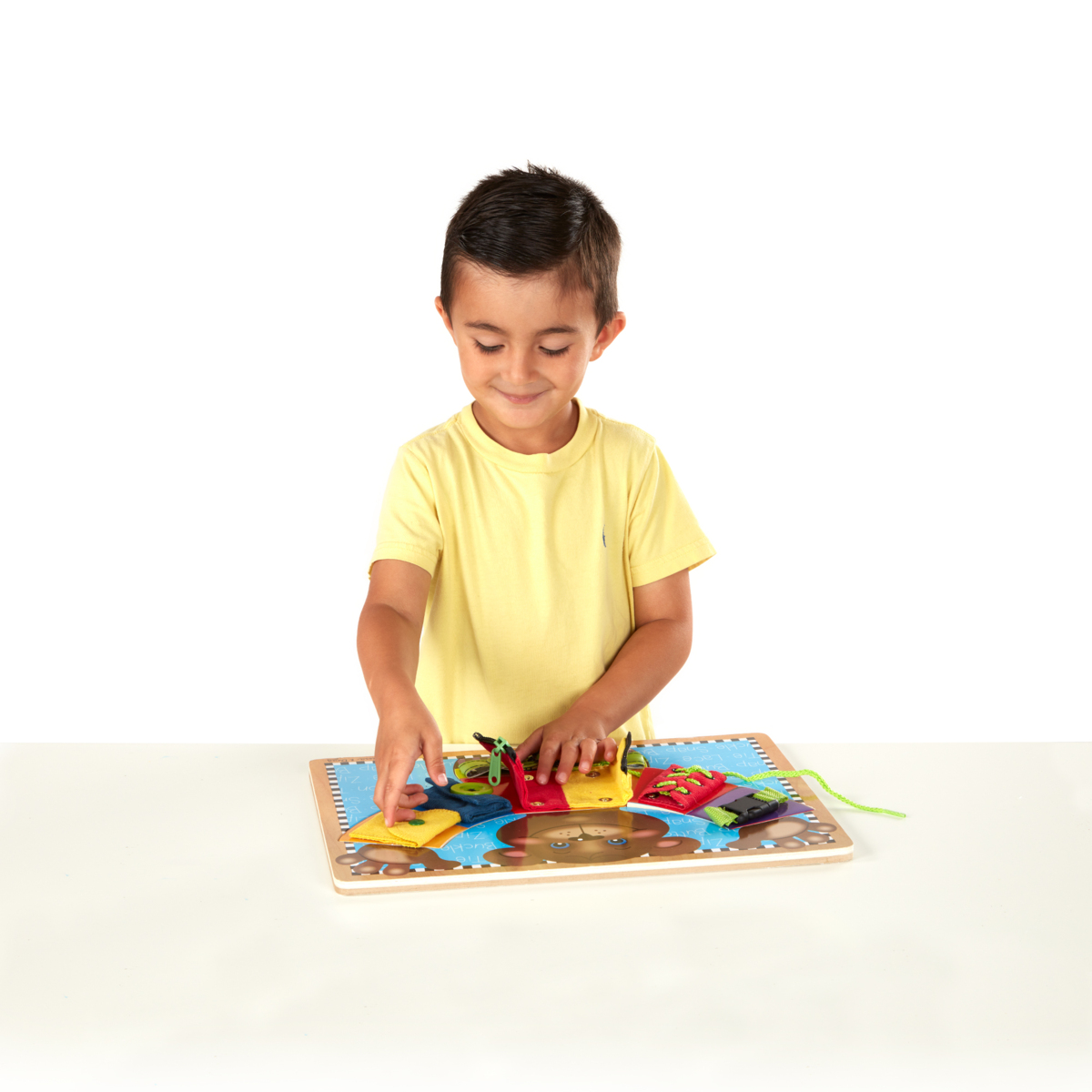 Att ta på sig kläder, knyta skorna, fästa remmarna och stänga väskan kräver en del av finmotoriken. För barn som inte bemästrar färdigheterna ännu, kan det vara bra att öva. På tavlan finns de 5 vanligaste låsanordningarna för kläder och skor: ett blixtlås, ett klickspänne, en knapp, en tryckknapp och ett skosnöre. Ingående FSC. Från 3 år.