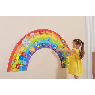 Kombinera kommunikation, stimulansrespons och orsakssamband med finmotorik och upptäckarlust. Varje del tänds med olika tekniker. Du kan trycka, växla, vrida, dra eller skjuta för att få cirkeln att lysa. Kan hängas på vägg eller användas på golv eller bord. Kräver 3 st AAA-batterier (ingår ej). Mått: 25x80x4 cm. Av plywood och ABS. PVC-fri. Från 10 månader.