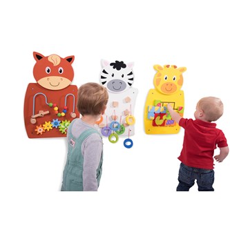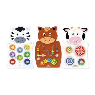 Väggtavlor med olika funktioner och spel gjorda av FSC-märkt kvalitetsträ. En idealisk leksak för träning av finmotoriken. Mått per tavla: 36x55x3,5 cm. PVC-fri. Från 18 månader.