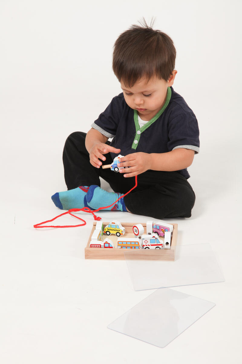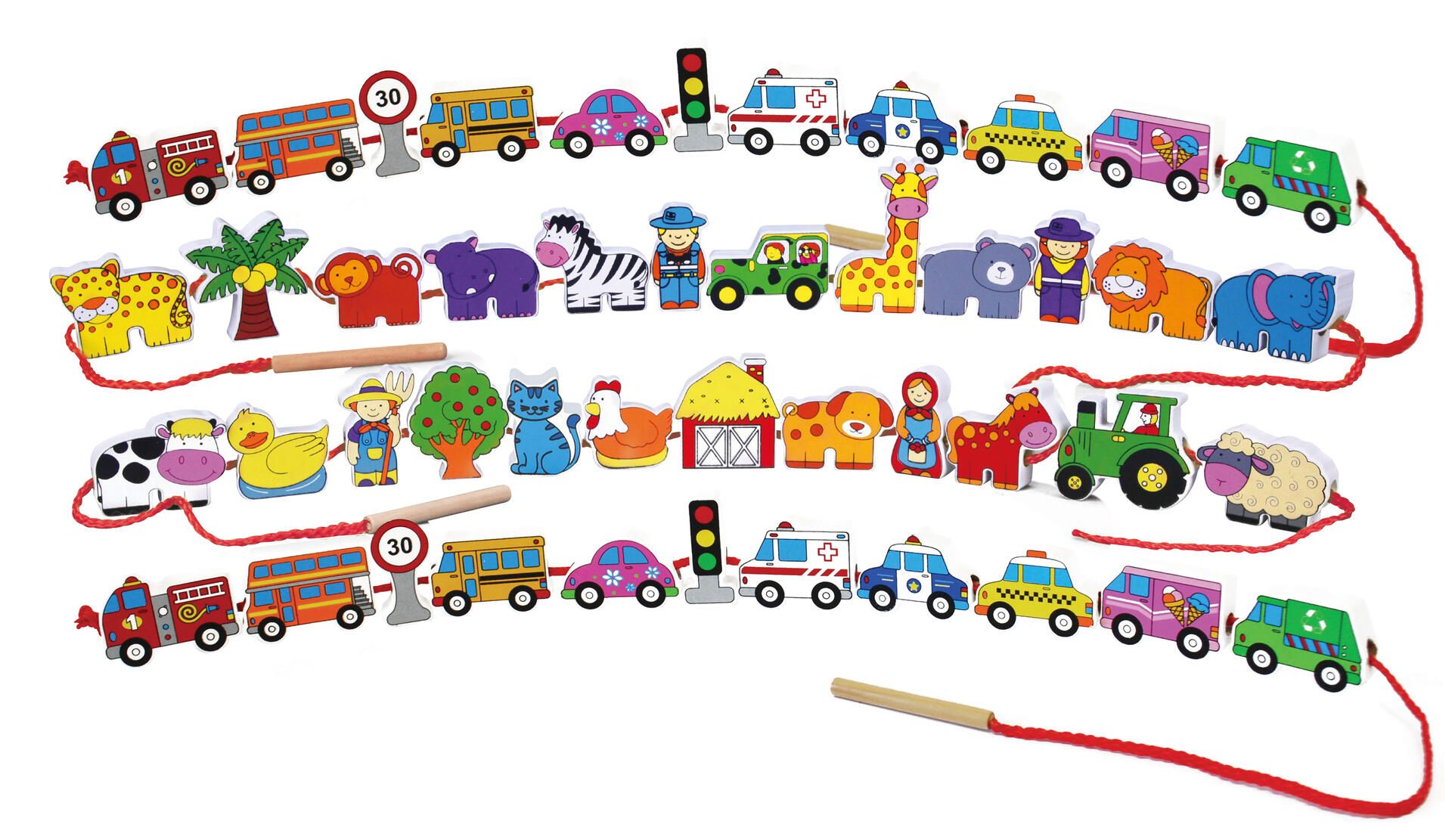 Detta set innehåller 48 olika figurer av trä inom 4 olika teman: fordon x 2, bondgård och safari. Figurerna har hål för att kunna träs på ett snöre, men kan även användas i figurlek eller som tillbehör till byggleken. Figurerna är målade på bägge sidor. Innehåller 48 figurer och 4 snören. Höjd på figurer 6 cm. PVC-fri. Från 3 år.