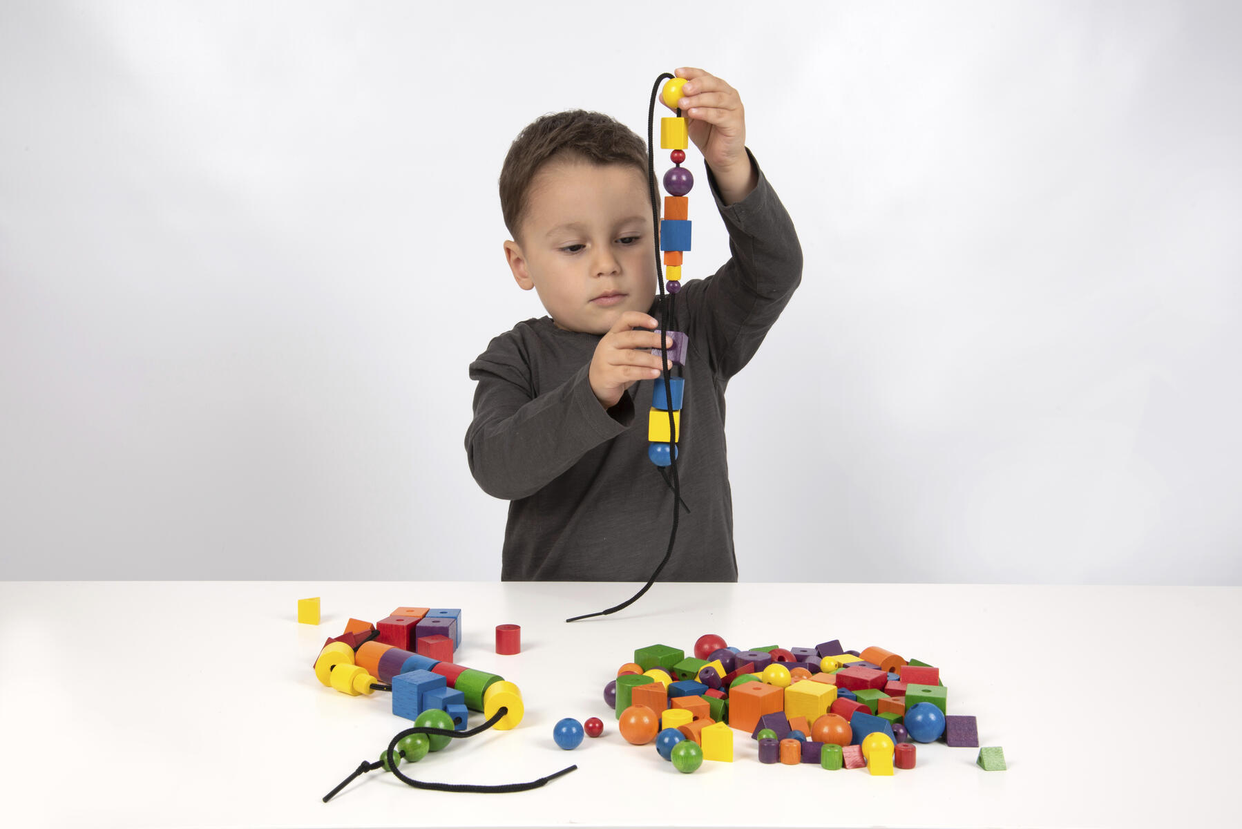Tränar uppfattningen av former, färger och sekvensering samtidigt som finmotoriken utvecklas. Välj ut ett arbetskort och lägg den ofullständiga sidan upp. Låt barnet sätta ihop den korrekta raden och vänd sedan kortet för att kontrollera att det blivit rätt. Korten har tre olika svårighetsgrader. Innehåller 72 träpärlor i olika former, 18 arbetskort och 12 snören. Av FSC-märkt trä. PVC-fri. Från 3 år.