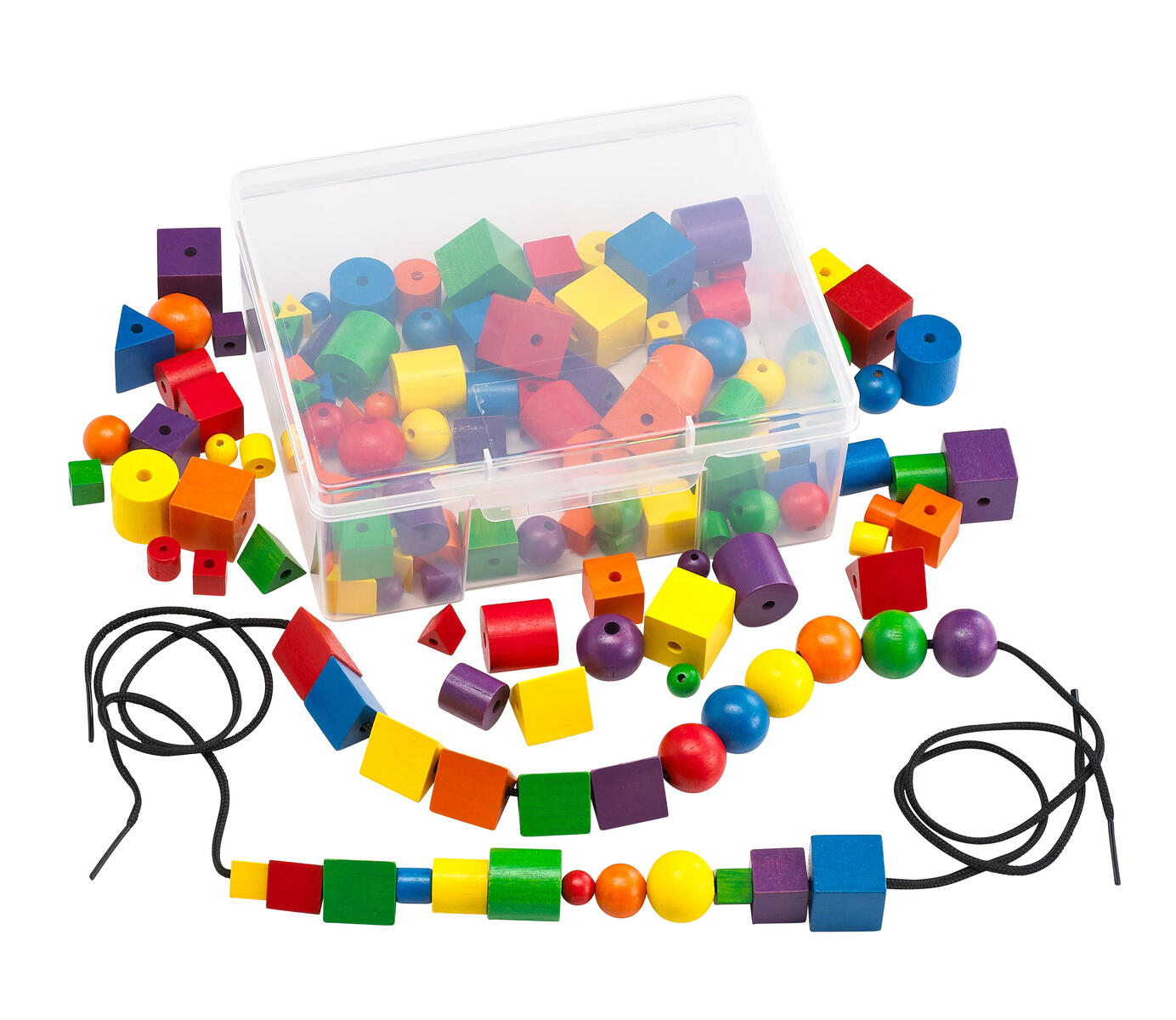 Ett stort set med snörpärlor i olika former, färger och storlekar. Tränar bl.a. öga-handkoordination. Innehåller totalt 144 delar och 2 snören. Mått på största kuben är 2,4 cm och längd på snören är 55 cm. Levereras i praktisk förvaringslåda med lock. PVC-fri. Från 3 år.
