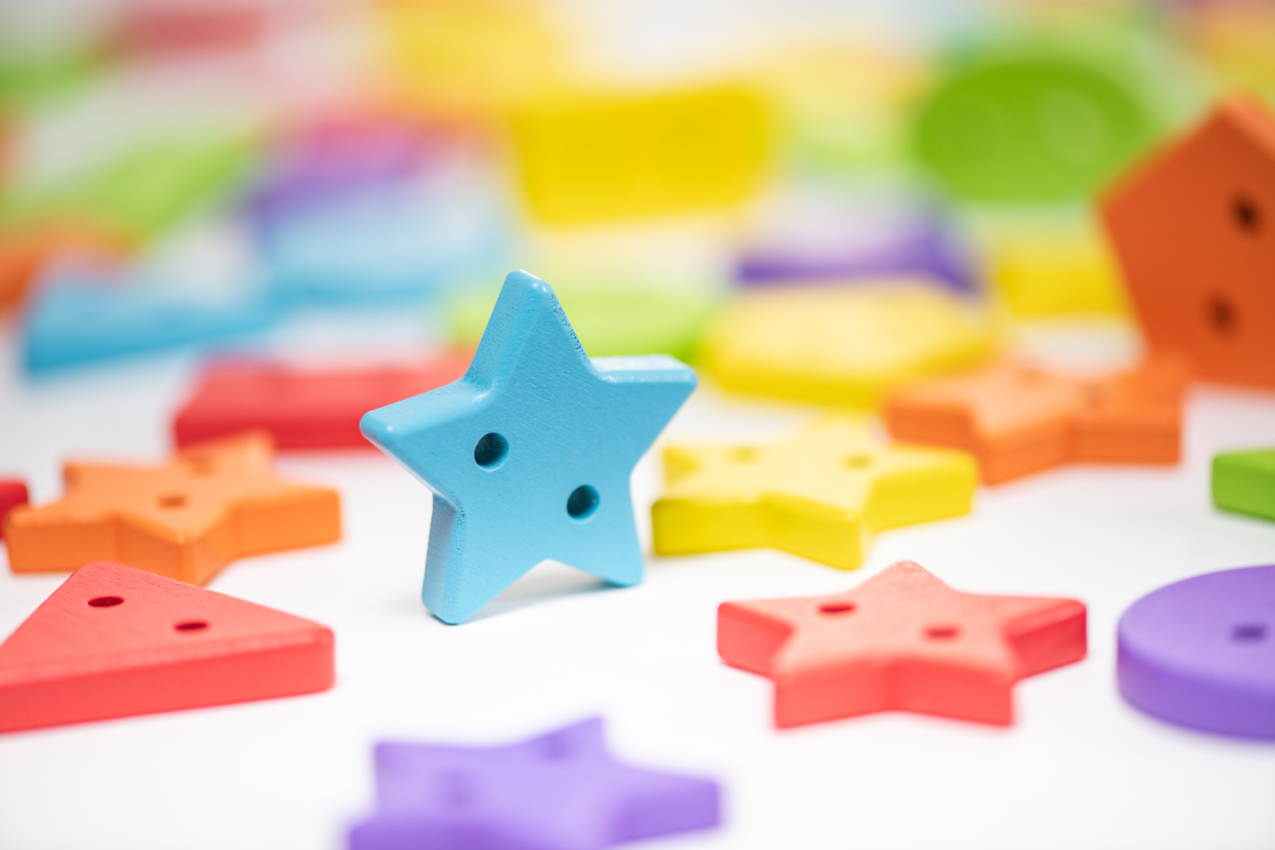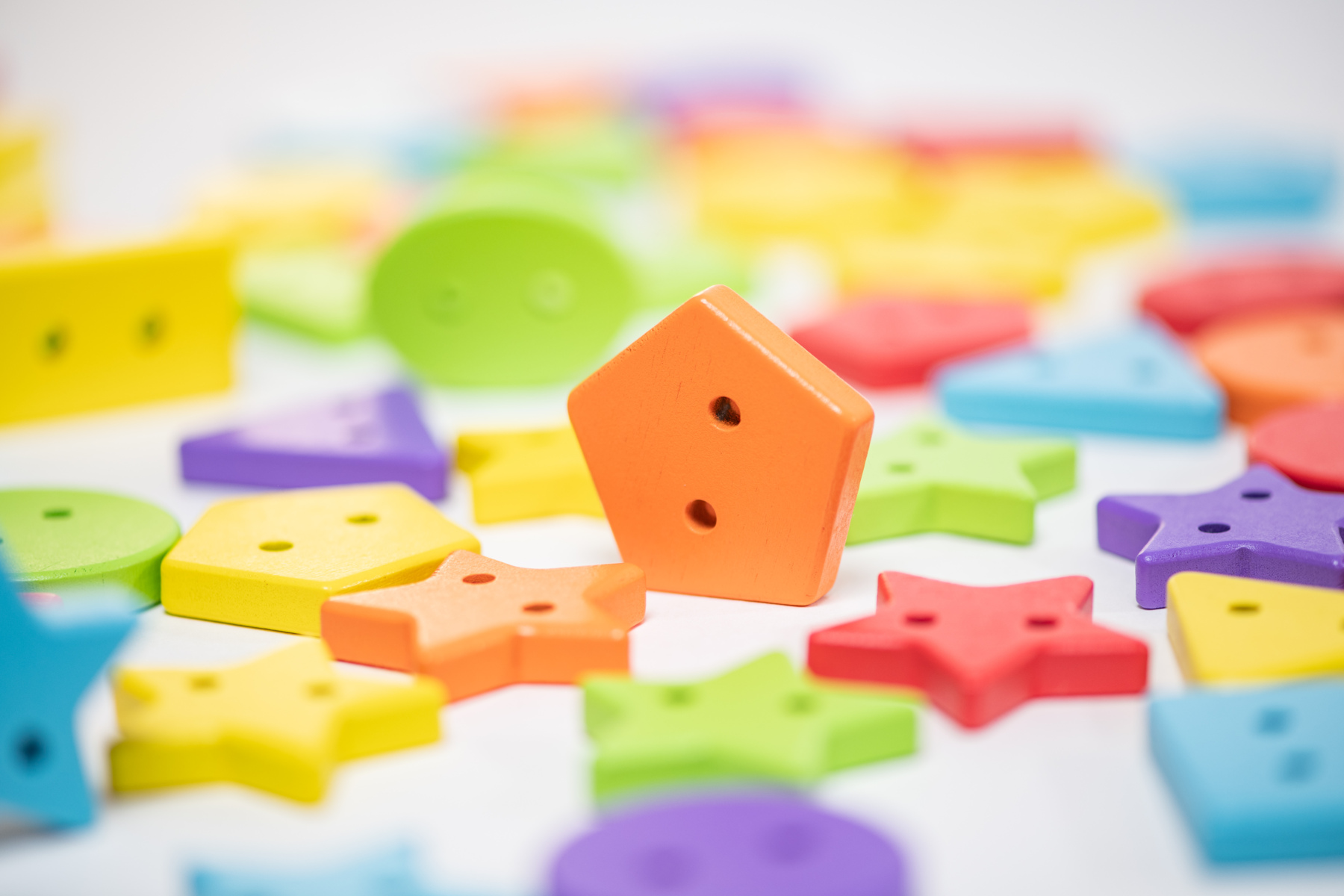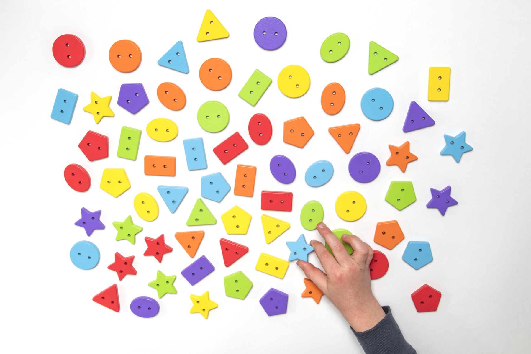 72 st/fp. 2 vardera av 6 former (cirkel, triangel, rektangel, femhörning, oval och stjärna) och 6 färger. Används till t.ex. form- och färgsortering, konst- och hantverksaktiviteter och snörning. Cirkel mäter 40x40x7 mm. Av FSC-märkt trä. PVC-fri. Från 3 år.