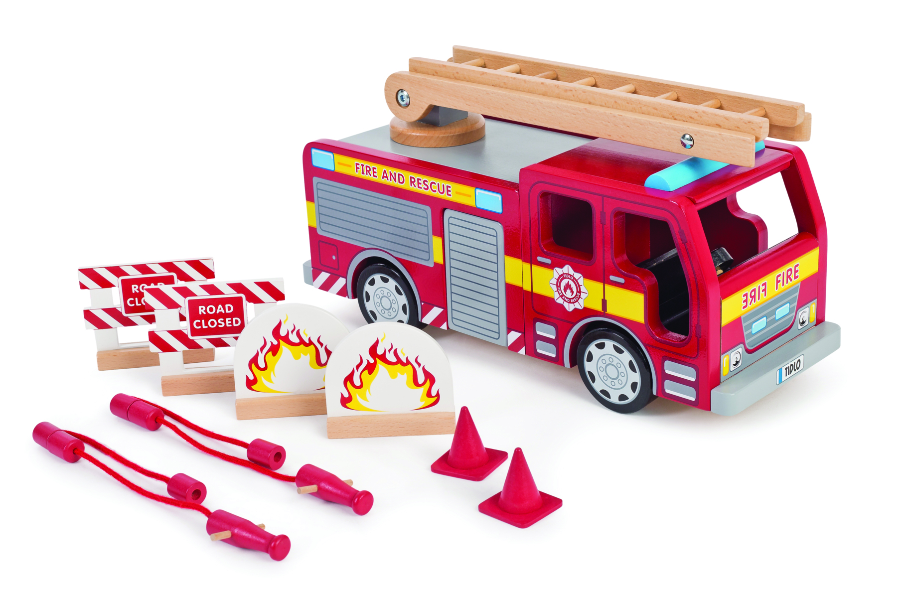 En stor och rejäl brandbil med avtagbart flak där man kan förvara brandslangarna. Med utdragbar stege som kan resas och vridas runt. Taket på förarhytten kan lyftas av och här finns det plats för brandmännen. Av FSC-märkt trä. Från 3 år.