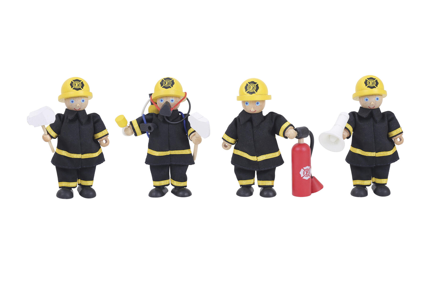 Fina brandmänsdockor i trä med böjbara armar och ben. Hål i händerna gör att de kan greppa de medföljande tillbehören som t.ex. slang, megafon och brandsläckare. Av trä. PVC-fri. Från 3 år.
