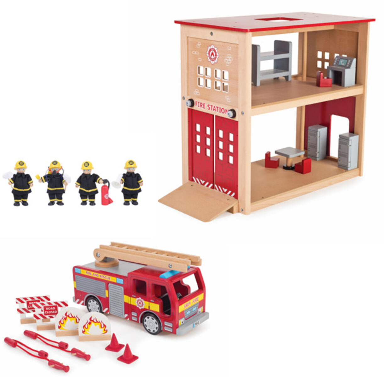 Ett komplett paket med brandstation i 2 plan med möbler, brandbil med utdragbar stege som kan resas och vridas runt och brandmän med böjbara armar och ben. Av trä, brandstation och brandbil av FSC-märkt trä. PVC-fri. Från 3 år.