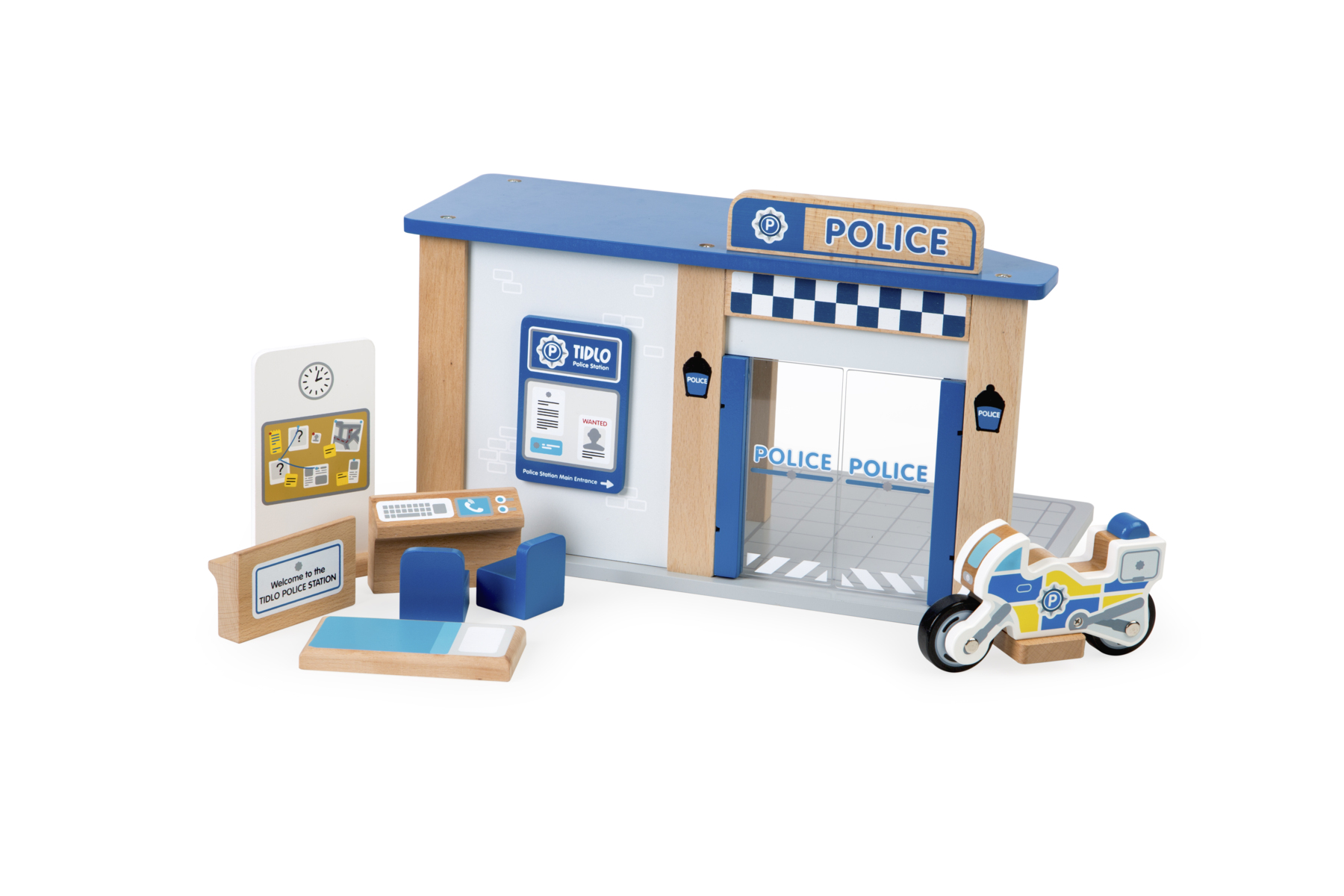 Station med oändliga lekscenarier. Levereras komplett med sju tillbehör: receptionsdisk, utsändningsdisk, 2 stolar, cellsängar, uppställningstavla och en poliscykel. Dessutom ett inbyggt fängelse med skjutdörrar som ser ut som galler. Uppmuntrar kreativ och fantasifull lek samtidigt som banren utvecklar öga-handkoordination och finmotorik. Mått: L39xB26xH25 cm. Av FSC-märkt trä. PVC-fri. Från 3 år.