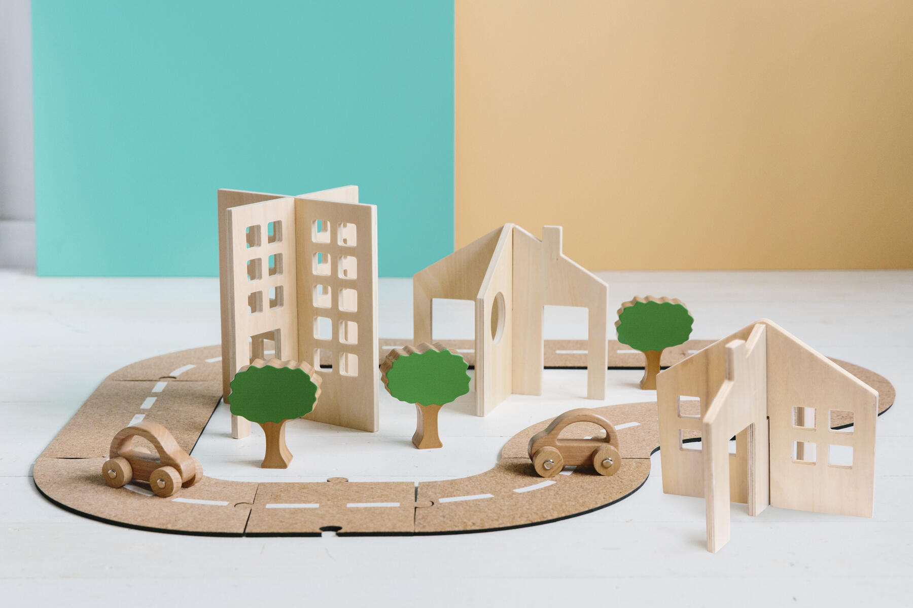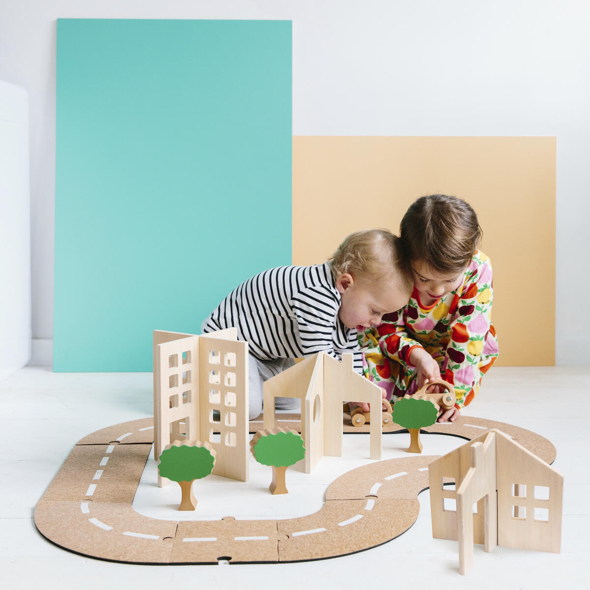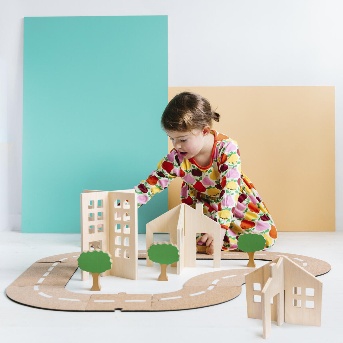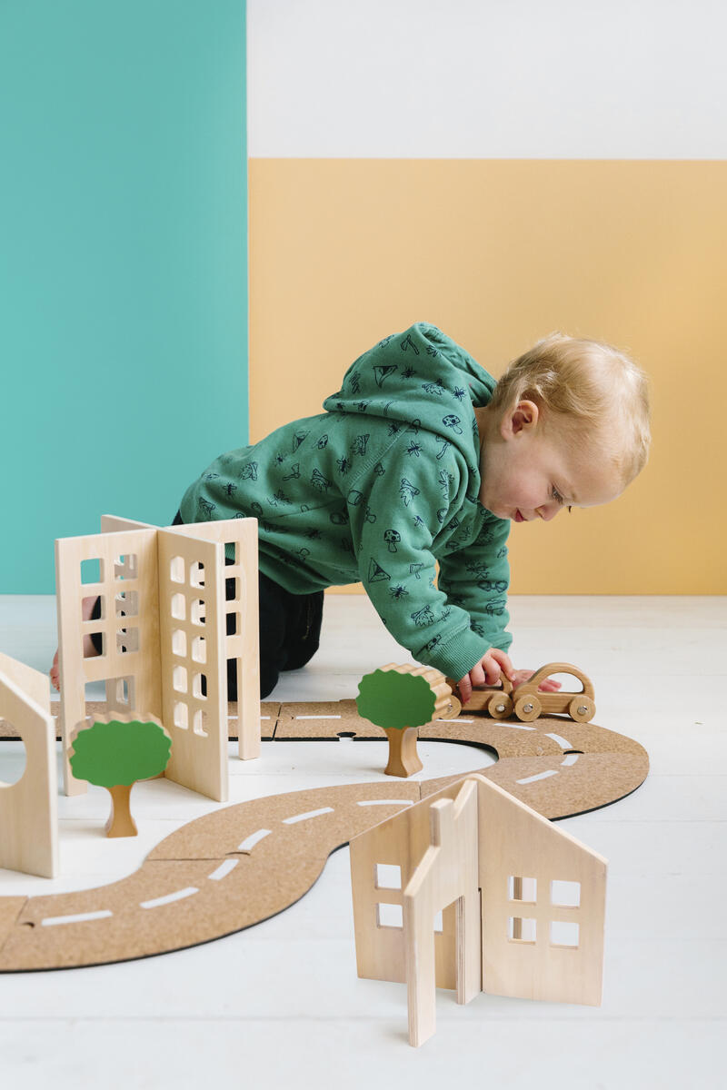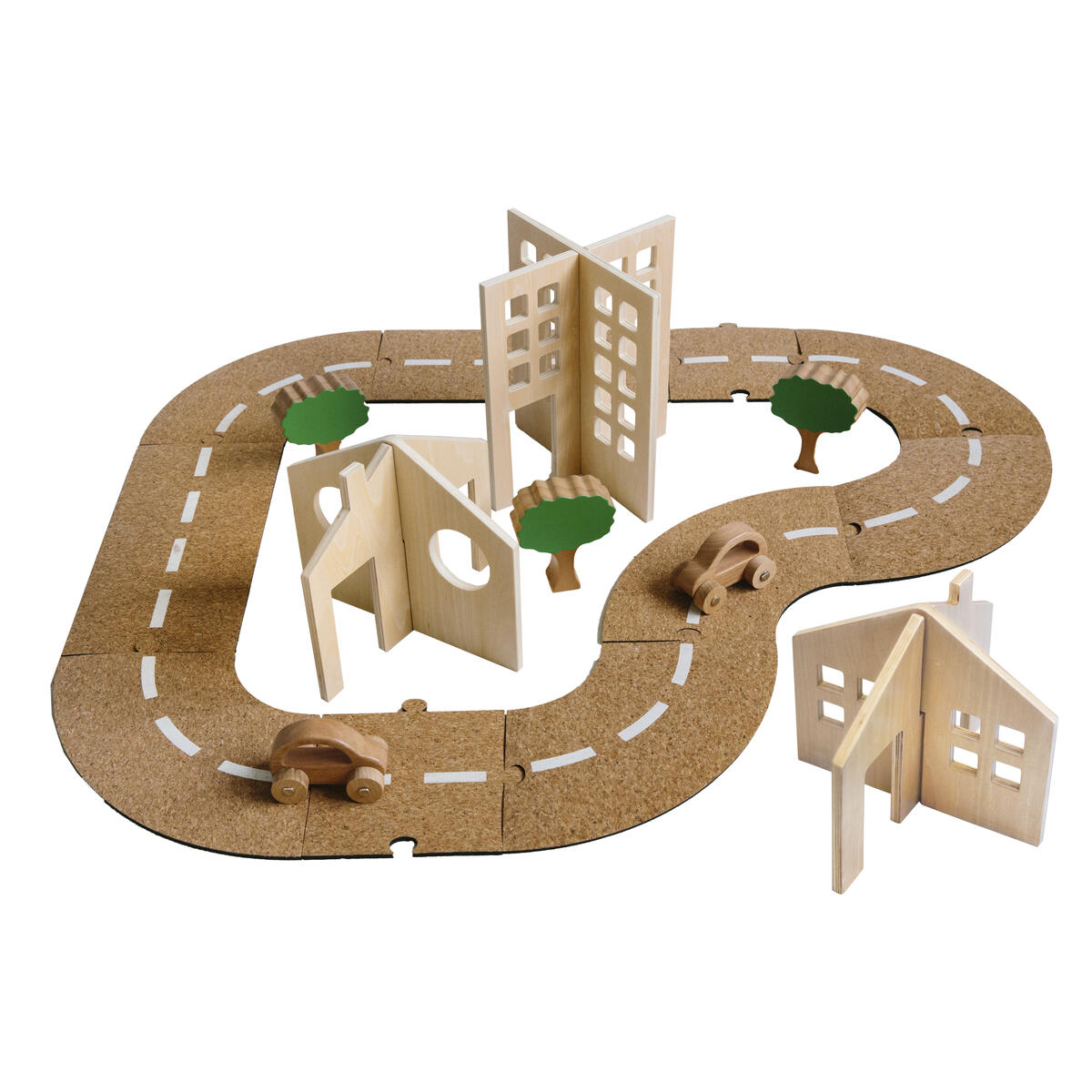17 delar. En rolig bilbana för de yngsta. Setet innehåller 10 vägdelar, 2 bilar, 3 träd och 2 byggnader. Mått på den största byggnaden: L20xB20xH23 cm. Av FSC-märkt trä och korkmaterial. PVC-fri. Från 3 år.