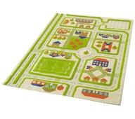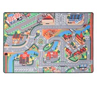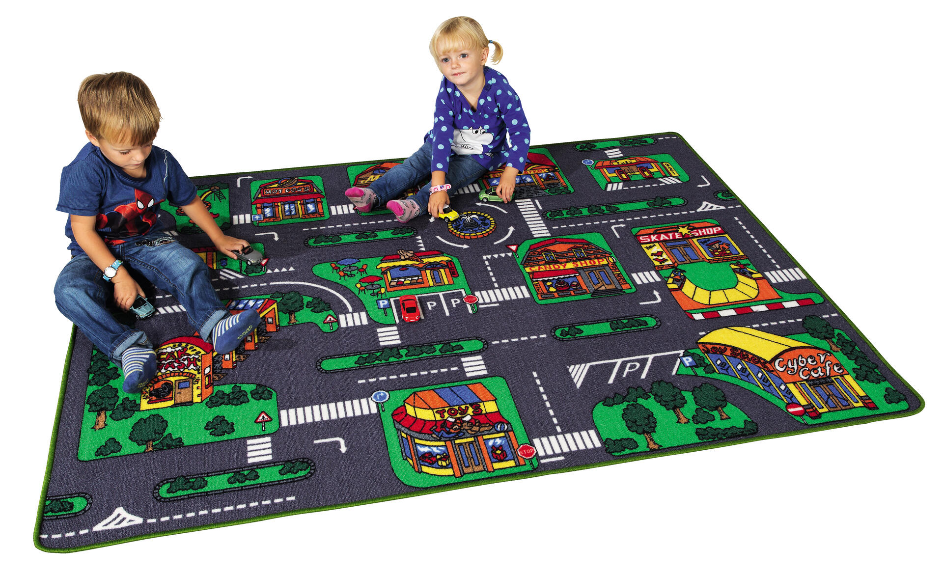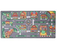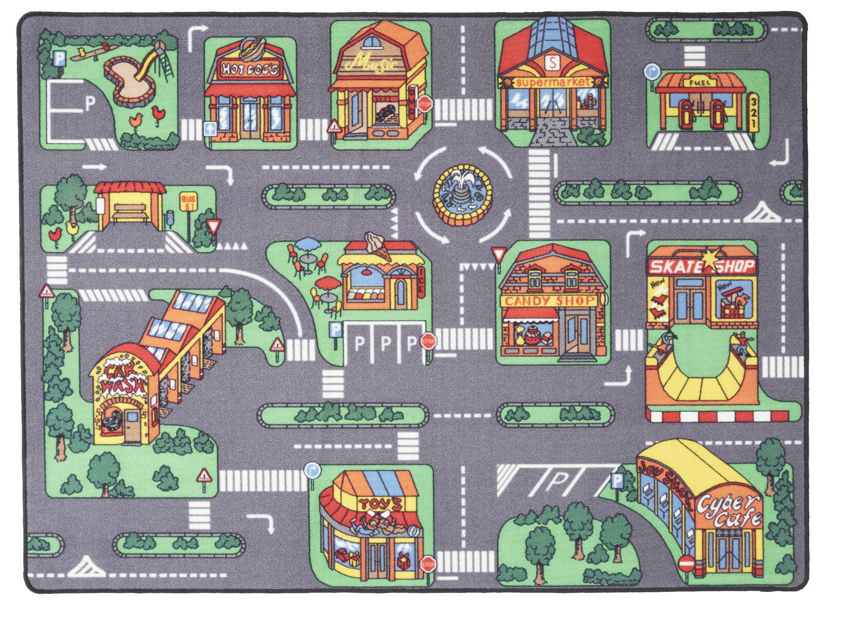 Trevlig lekmatta med motiv föreställande butiker, biltvätt etc. Halkskydd under. Av 100 % polyamid. PVC-fri. Rengöres via dammsugning, fläckar tas bort med milt rengöringsmedel och en blöt trasa.