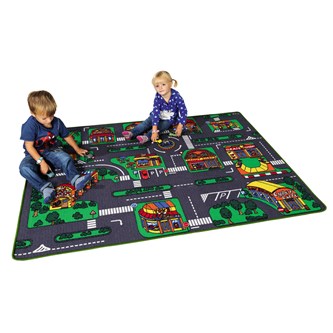 En stor matta där det finns plats för mycket fordonslek och flera barn kan leka samtidigt. Av 100 % nylon, gummerad undersida av latex. Rengöres via dammsugning, fläckar tas bort med milt rengöringsmedel och blöt trasa. PVC-fri.