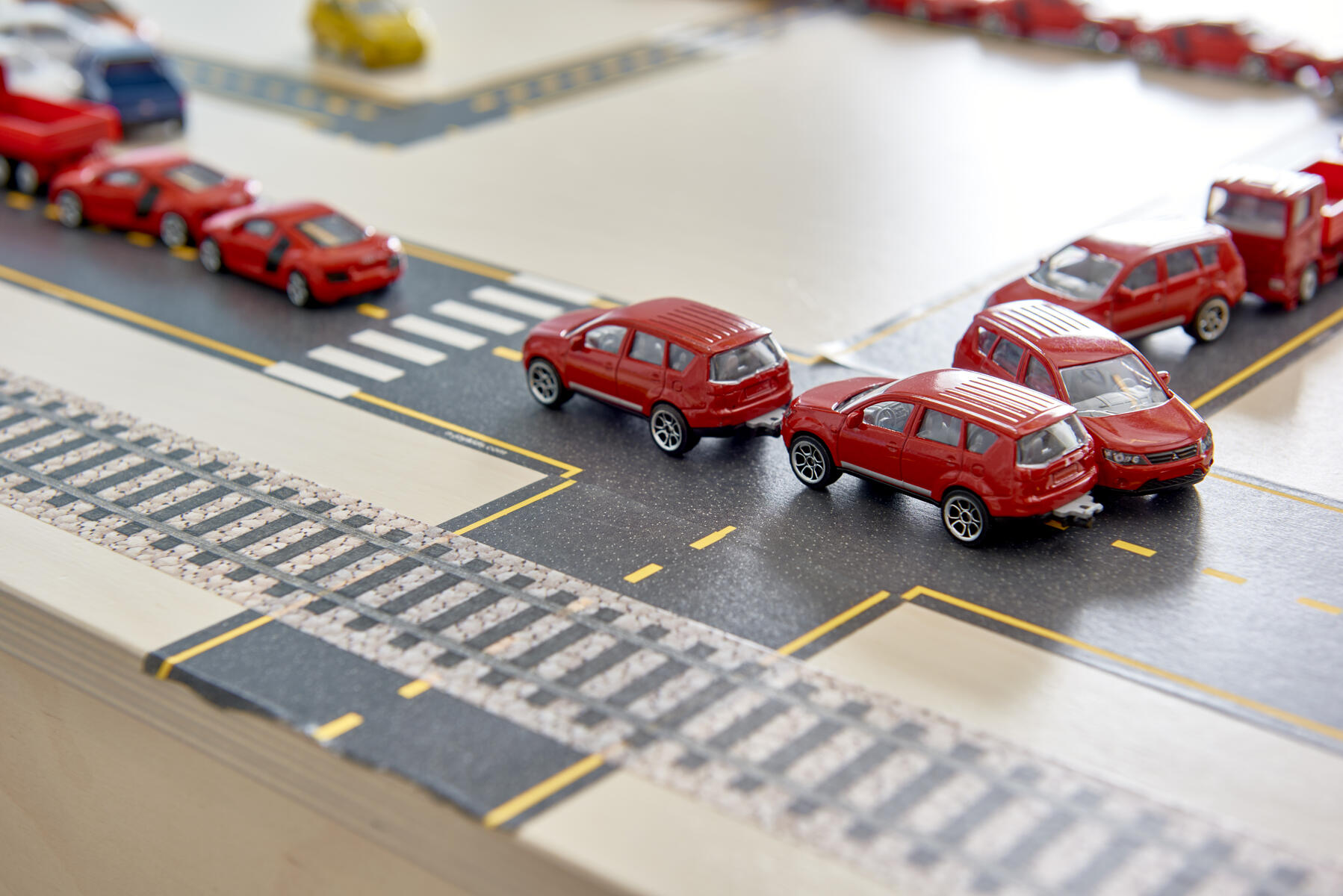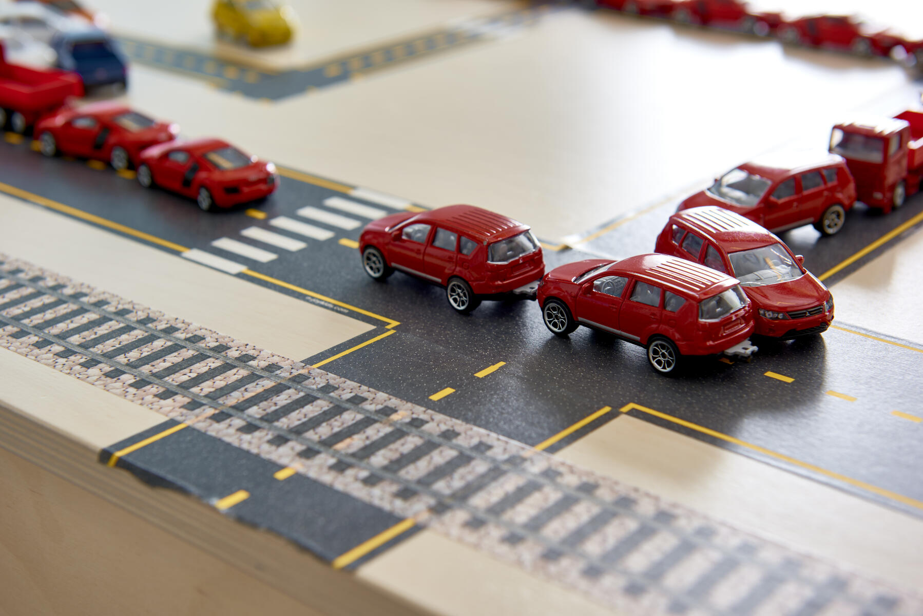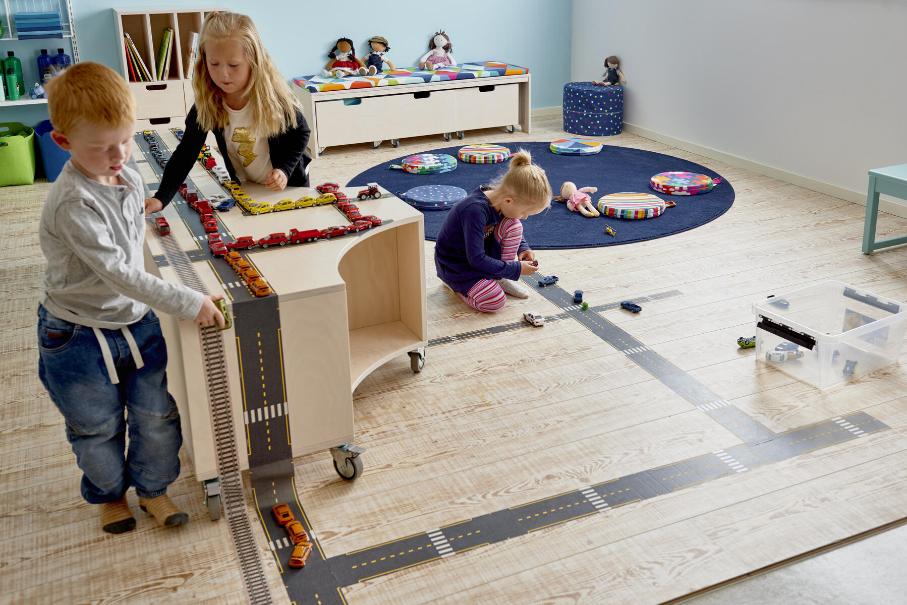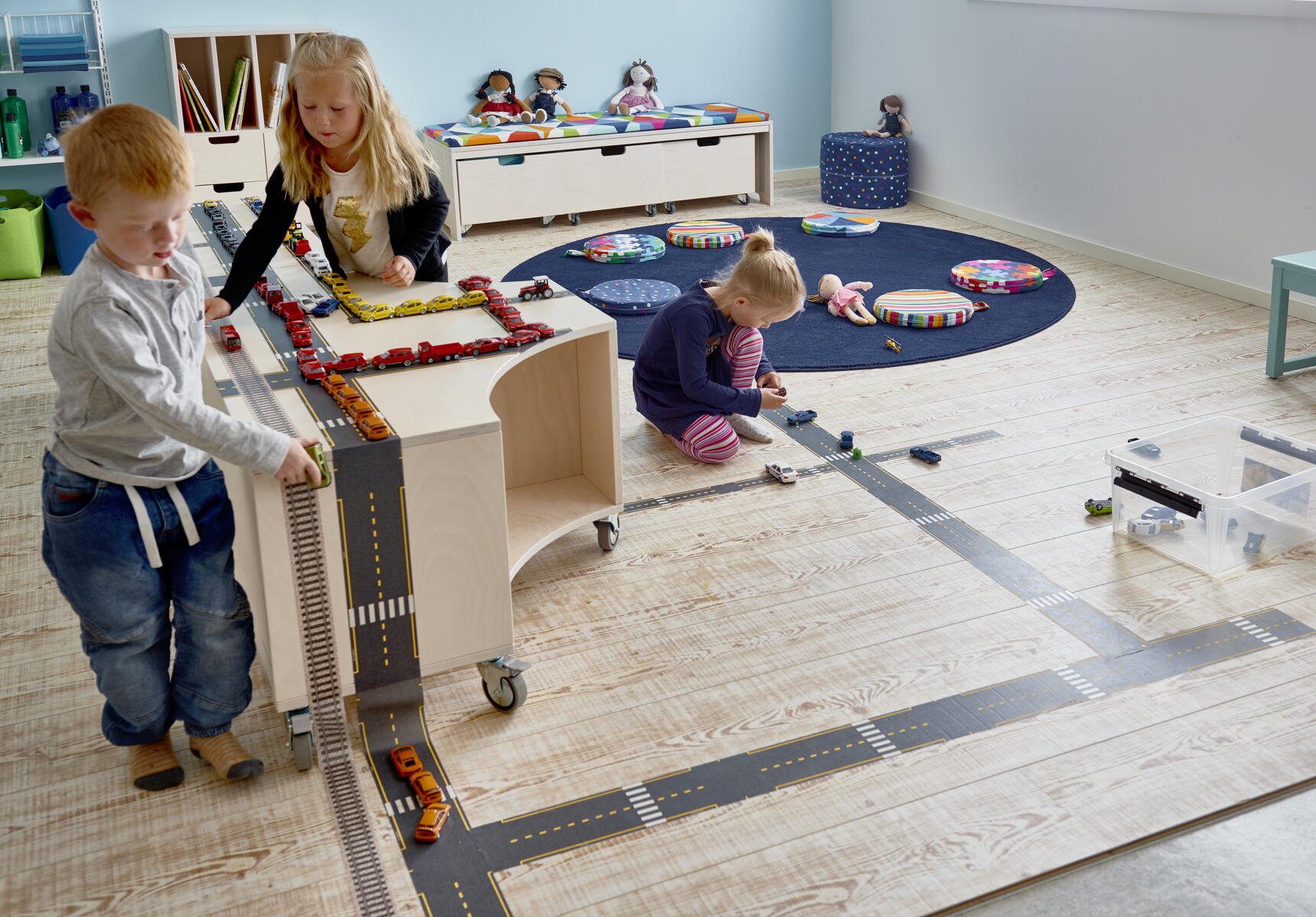 En stor matta där det finns plats för mycket fordonslek och flera barn kan leka samtidigt. Av 100 % nylon, gummerad undersida av latex. Rengöres via dammsugning, fläckar tas bort med milt rengöringsmedel och blöt trasa. PVC-fri.