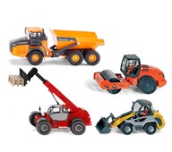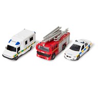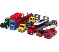 25 st/fp. En stor förpackning som innehåller metallbilar med gummerade däck och plastdetaljer av ABS. Bilsetet innehåller räddningsfordon, arbetsfordon och vanliga bilar. Blandade modeller, dubbletter förekommer. Längd cirka 7 cm. PVC-fri. Från 3 år.