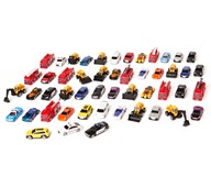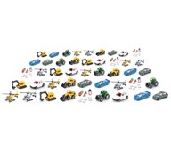 50 st/fp. En stor förpackning som innehåller metallbilar med gummerade däck och plastdetaljer. Bilsetet innehåller räddningsfordon, arbetsfordon och vanliga bilar. Blandade modeller, dubbletter förekommer. Längd cirka 7 cm. PVC-fri. Från 3 år.