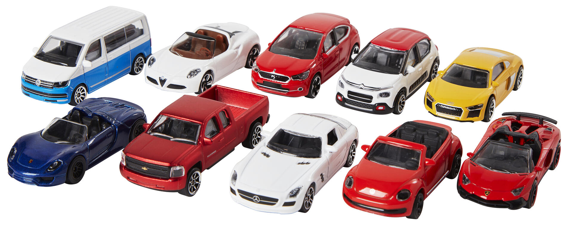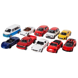 10 st/fp. Lite större metallbilar med gummerade däck och plastdetaljer av ABS. Blandade modeller från välkända bilmärken. Innehållet kan variera, dubbletter förekommer. Längd cirka 10 cm. PVC-fri. Från 3 år.