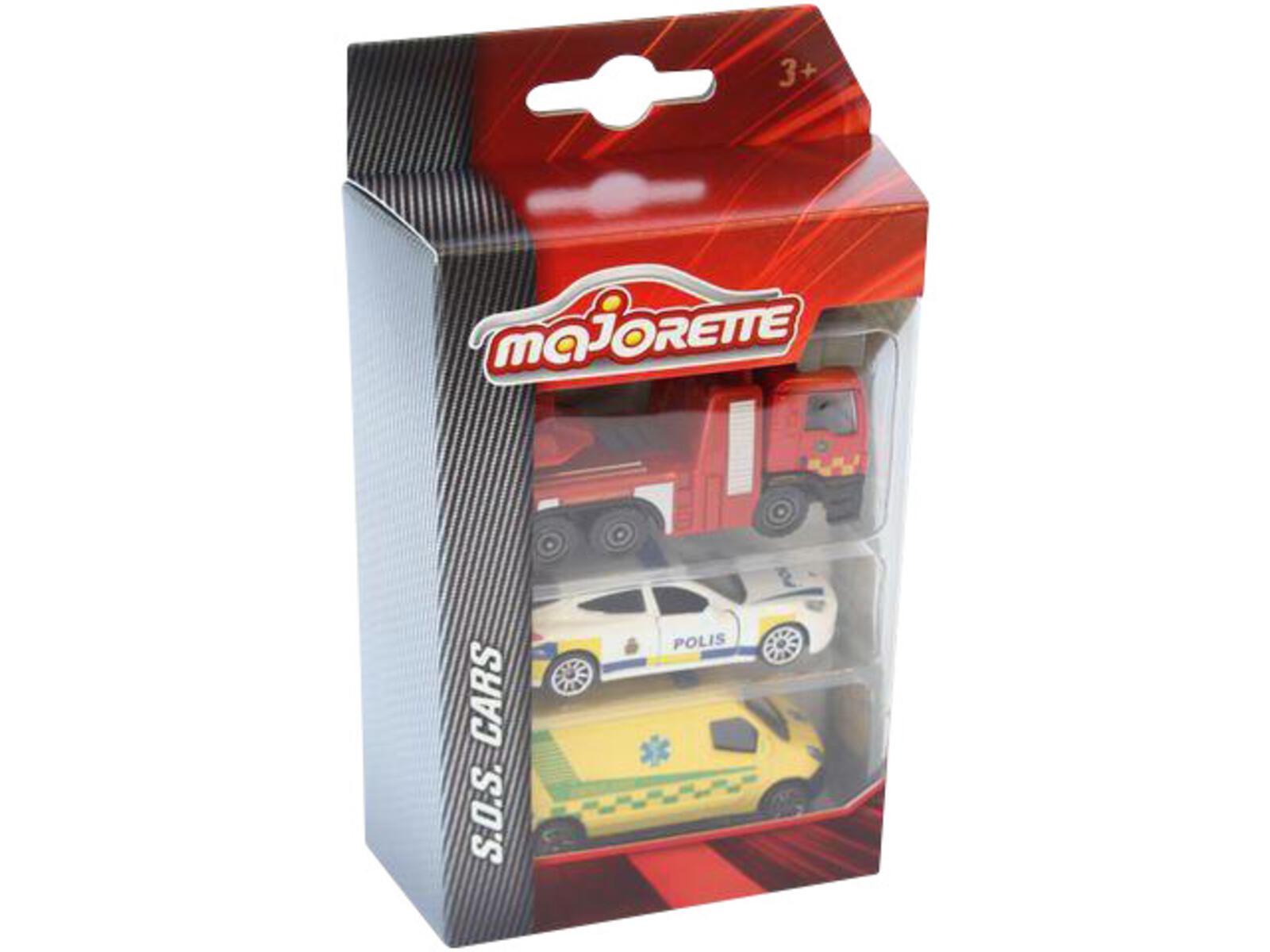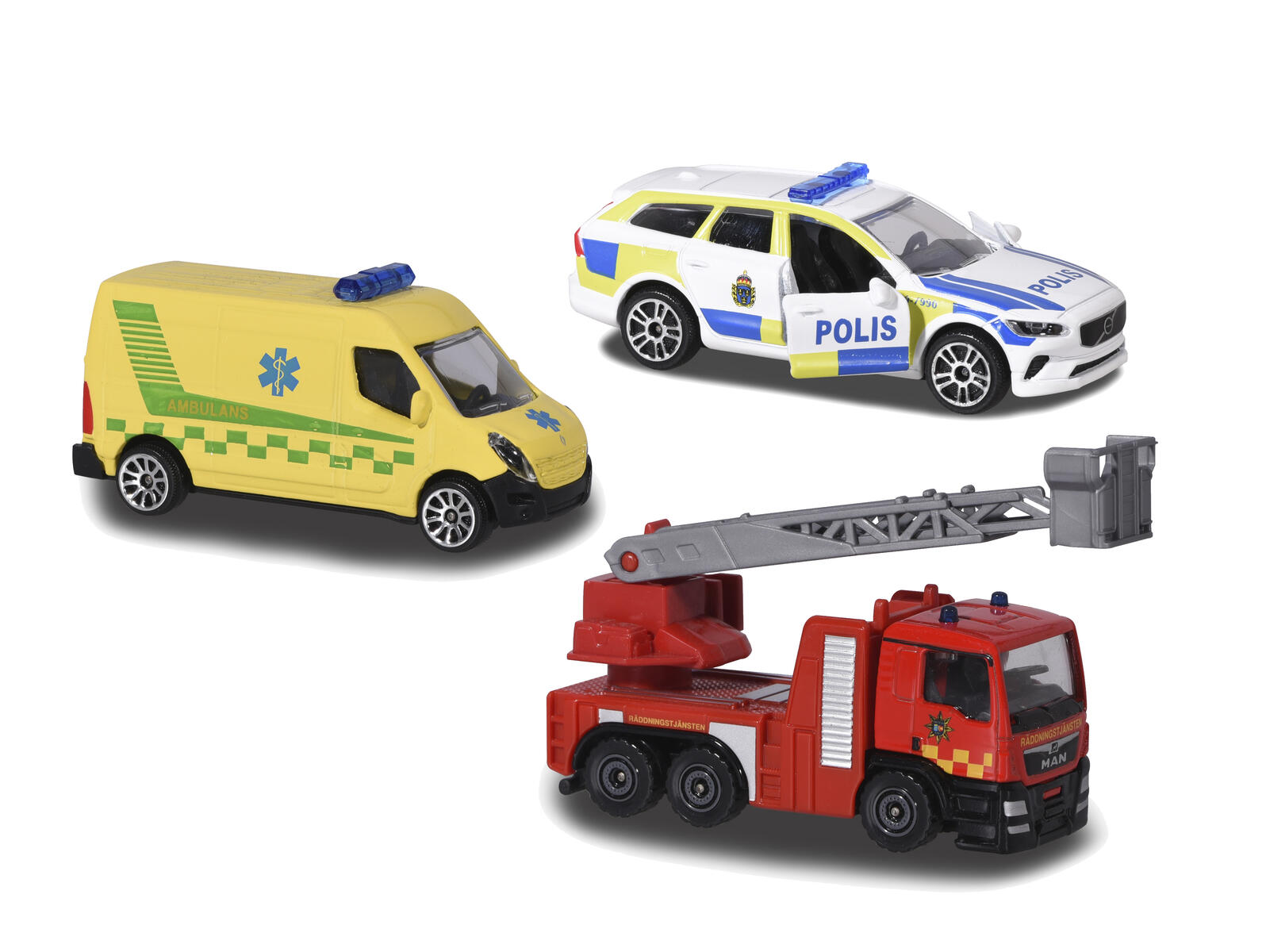 25 st/fp. En stor förpackning som innehåller metallbilar med gummerade däck och plastdetaljer av ABS. Bilsetet innehåller räddningsfordon, arbetsfordon och vanliga bilar. Blandade modeller, dubbletter förekommer. Längd cirka 7 cm. PVC-fri. Från 3 år.