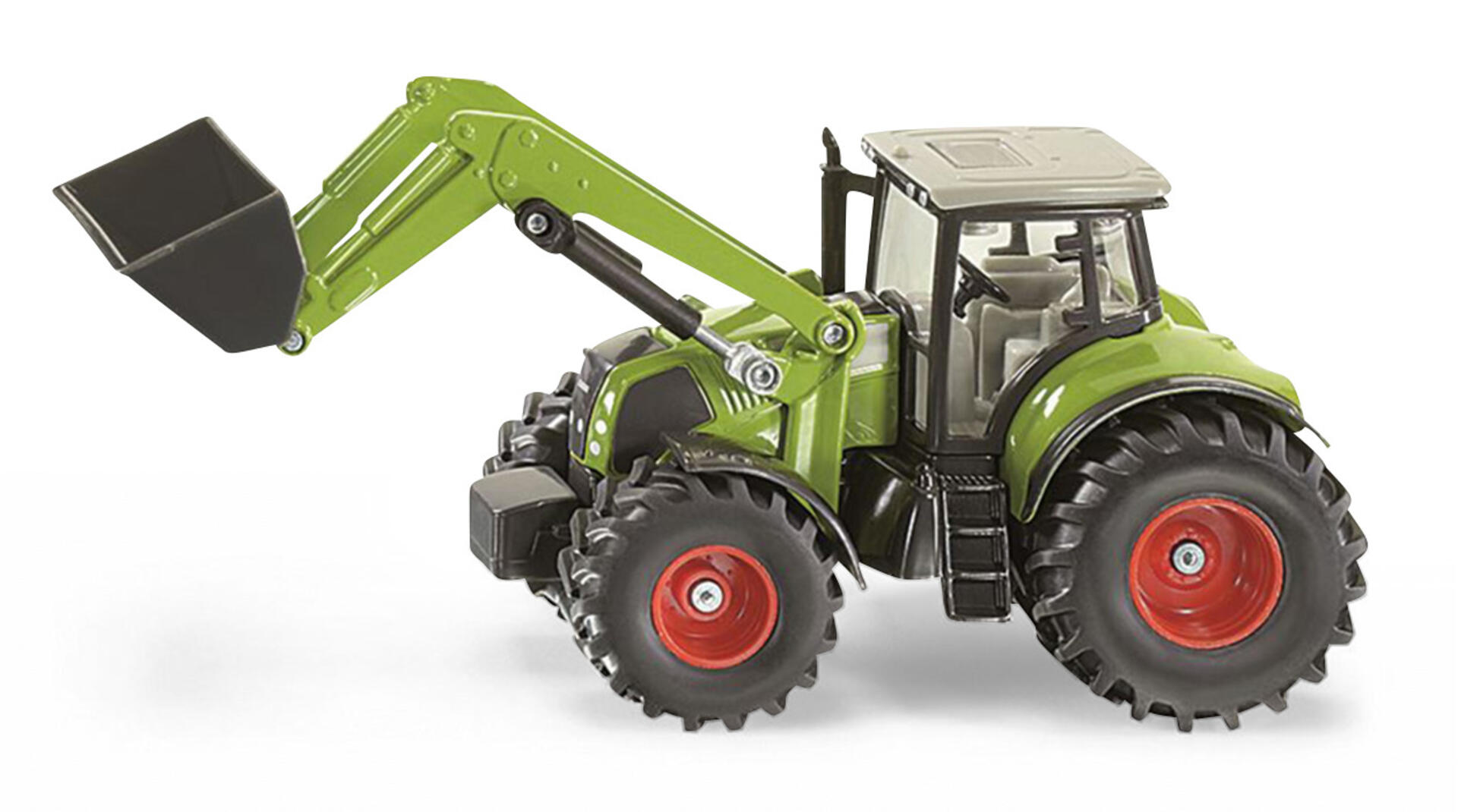 En Claas Axion med rörlig frontlastare och skopa som kan fällas in. Den helglasade förarhytten är avtagbar och traktorn har gummidäck. Traktorn är rejäl och gjord av metall med plastdetaljer. Skala 1:50. Från 3 år.