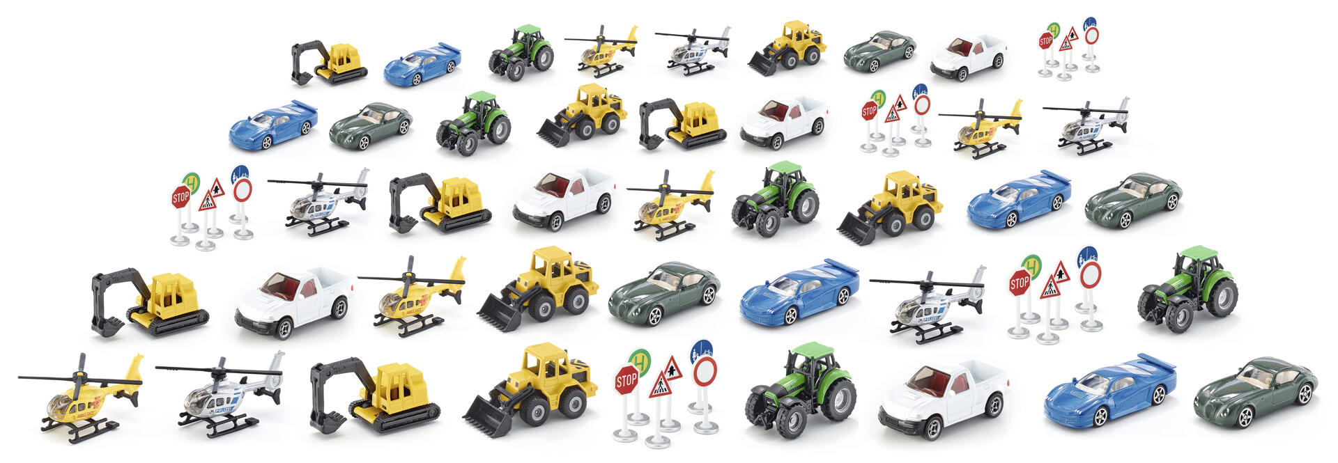 25 st/fp. En stor förpackning som innehåller metallbilar med gummerade däck och plastdetaljer av ABS. Bilsetet innehåller räddningsfordon, arbetsfordon och vanliga bilar. Blandade modeller, dubbletter förekommer. Längd cirka 7 cm. PVC-fri. Från 3 år.