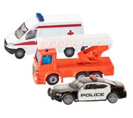 25 st/fp. En stor förpackning som innehåller metallbilar med gummerade däck och plastdetaljer av ABS. Bilsetet innehåller räddningsfordon, arbetsfordon och vanliga bilar. Blandade modeller, dubbletter förekommer. Längd cirka 7 cm. PVC-fri. Från 3 år.