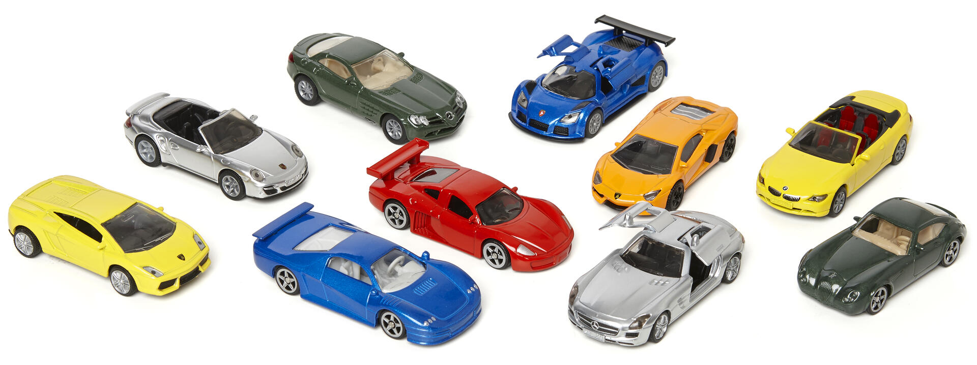 Fräcka bilar i metall med gummerade däck och plastdetaljer av ABS. 10 blandade modeller i varierande utförande, dubbletter förekommer. Längd cirka 7 cm. PVC-fri. Från 3 år.