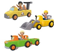 Setet innehåller en lastbil som är 20 cm lång av polyeten, en frontlastare som är 30 cm lång och en traktor med släp som är 42 cm lång av PE och PP. Svanenmärkt, licensnummer 50950001. PVC-fri. Från 2 år.