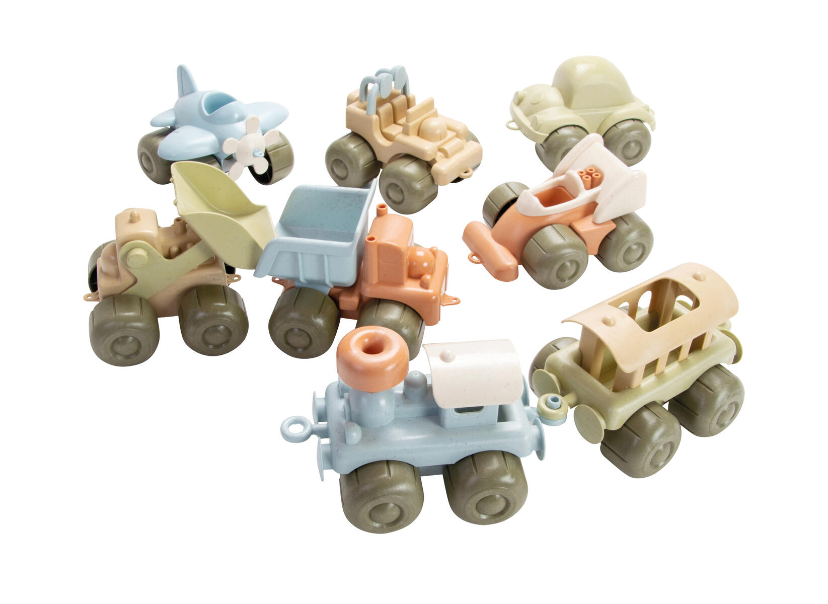 Fordon som är helt baserade på sockerrör och 100 % återvinningsbara. Innehåller bil, traktor, lastbil, jeep, racerbil, flygplan och tåg med vagn. Svanenmärkt, licensnummer 50950001. PVC-fri. Från 2 år.