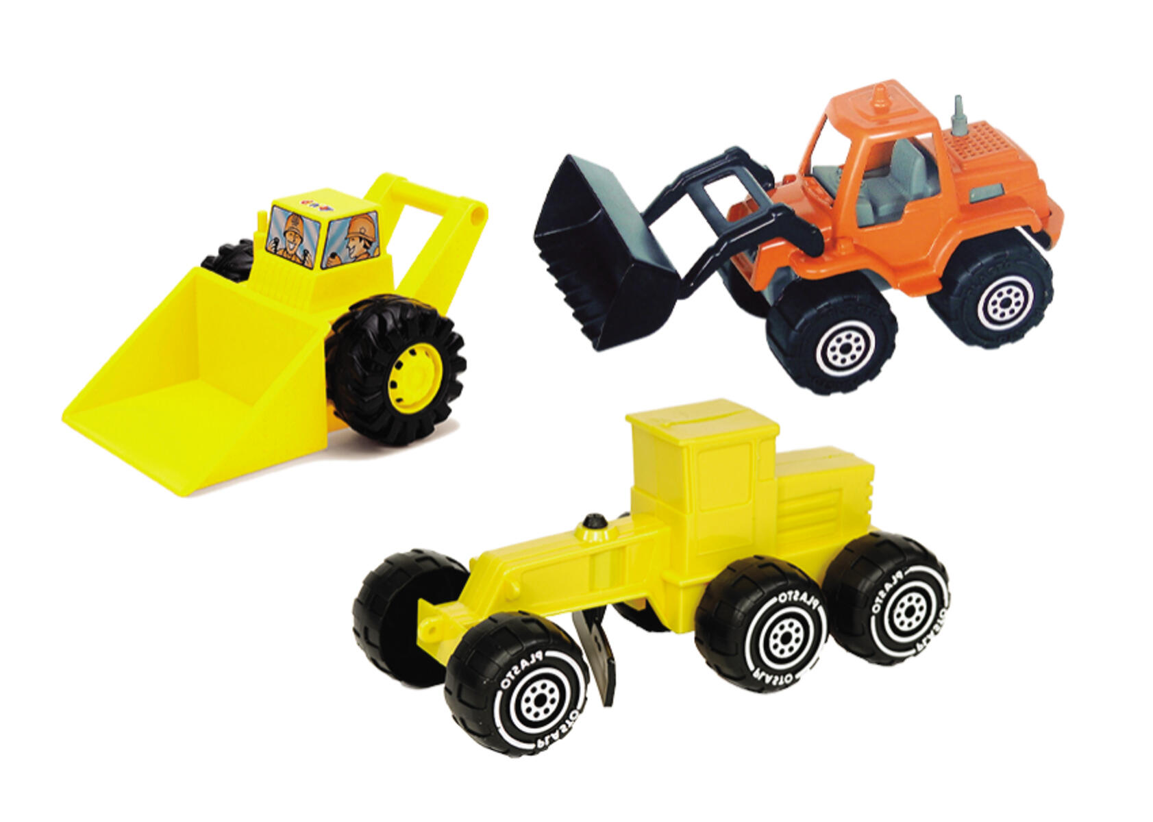 Setet innehåller en frontlastare som är 24 cm lång, en bulldozer med handtag som är 30 cm lång samt en vägskrapa som är 19 cm lång. Av PP och PE. PVC-fri. Från 2 år.